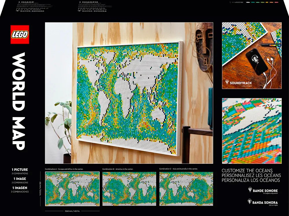 同样可被视为居家展示的绝妙藏品,乐高世界地图拥有夸张的 11695 块乐高颗粒构成,成为首个积木数量破万片的单品套装,成品更长达 1 米级别。