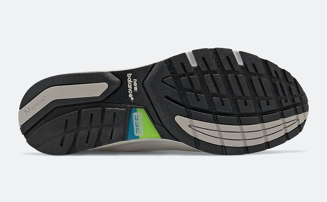 以蓝、绿色拼接为背景的 992 字样镶嵌在黑色外底上 ,增添一抹亮眼的细节。
