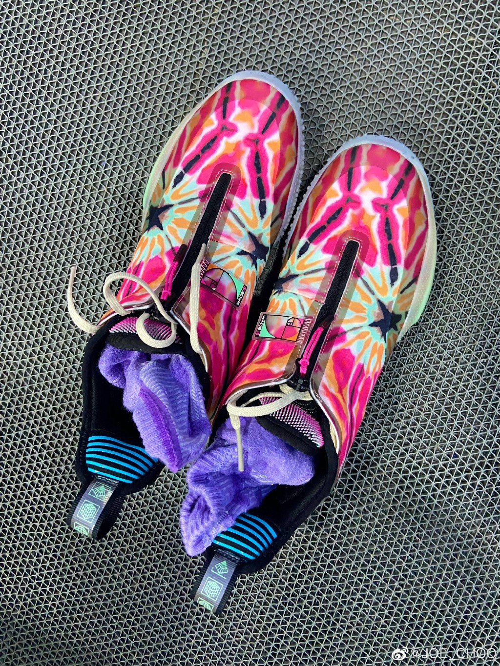 鞋面满印扎染图案,粉、橙、绿等彩色穿插,极为花哨亮眼。