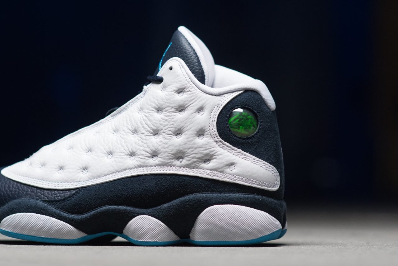 本次再度注入 Air Jordan 13 之上,深蓝色由鞋舌至鞋头再向两边延伸,内外鞋侧的白色辅以波点车线勾勒,营造细腻出众的皮革质感。