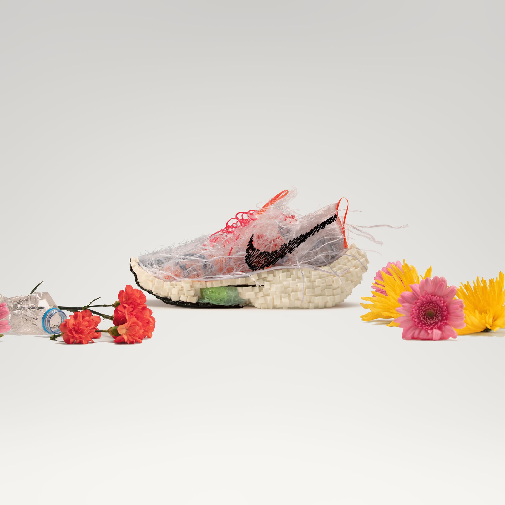 全新 Alphafly Next Nature 将 Zoom Air 气垫的生产边角料,通过 3D 打印的方式重新利用,制成 Flyprint 和 Flyknit 混合型鞋面织物。
