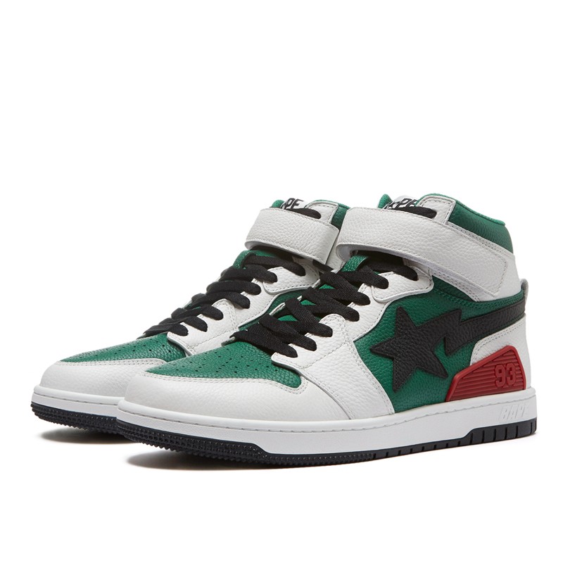 BAPE BLOCK STA HI 则主打极具复古感的白绿配色,鞋身整体采用柔软细腻的荔枝皮,更具高级质感。