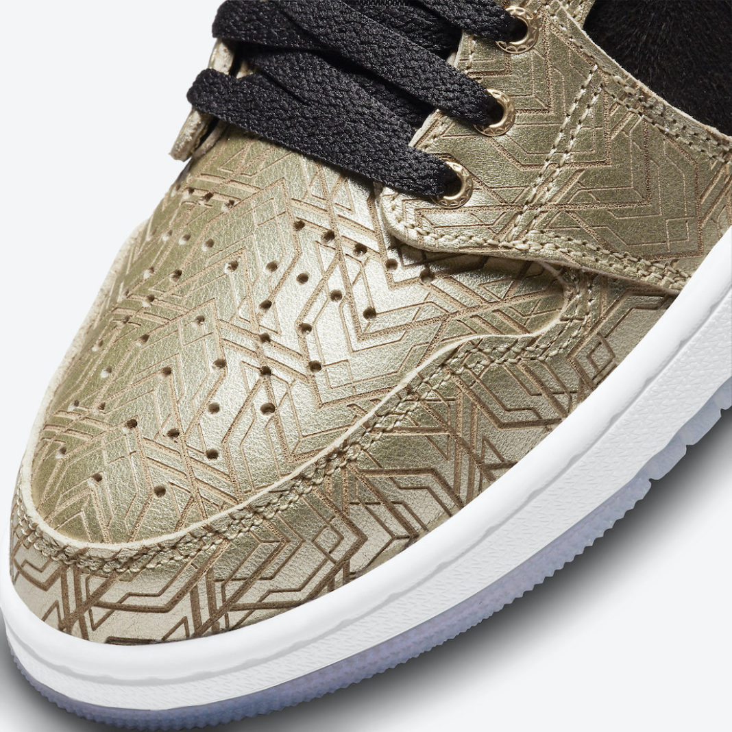 整双鞋采用金色激光蚀刻图案覆盖鞋面,营造出一种奢华的视觉效果。鞋侧、鞋领以黑色麂皮材质打造,简约又不失质感。