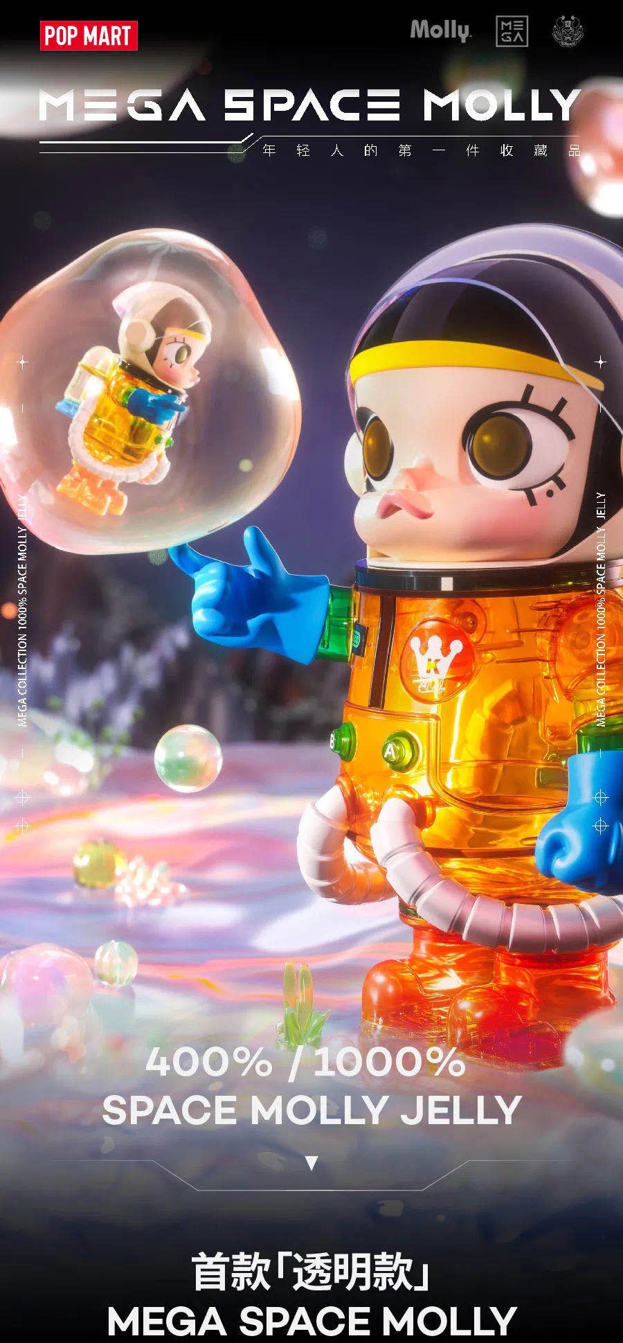 近期,最新一款也是首个透明款 MEGA SPACE MOLLY「JELLY」开启登记抽签,全球限量 2000 体,定价 ¥4999 RMB。