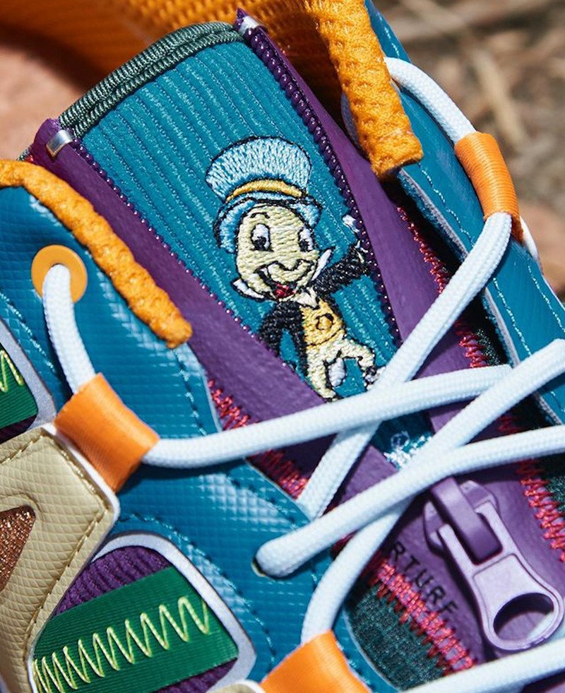 鞋舌位置点缀迪士尼 Jiminy Cricket(吉明尼蟋蟀)的卡通人物形象,彰显三方联名身份。