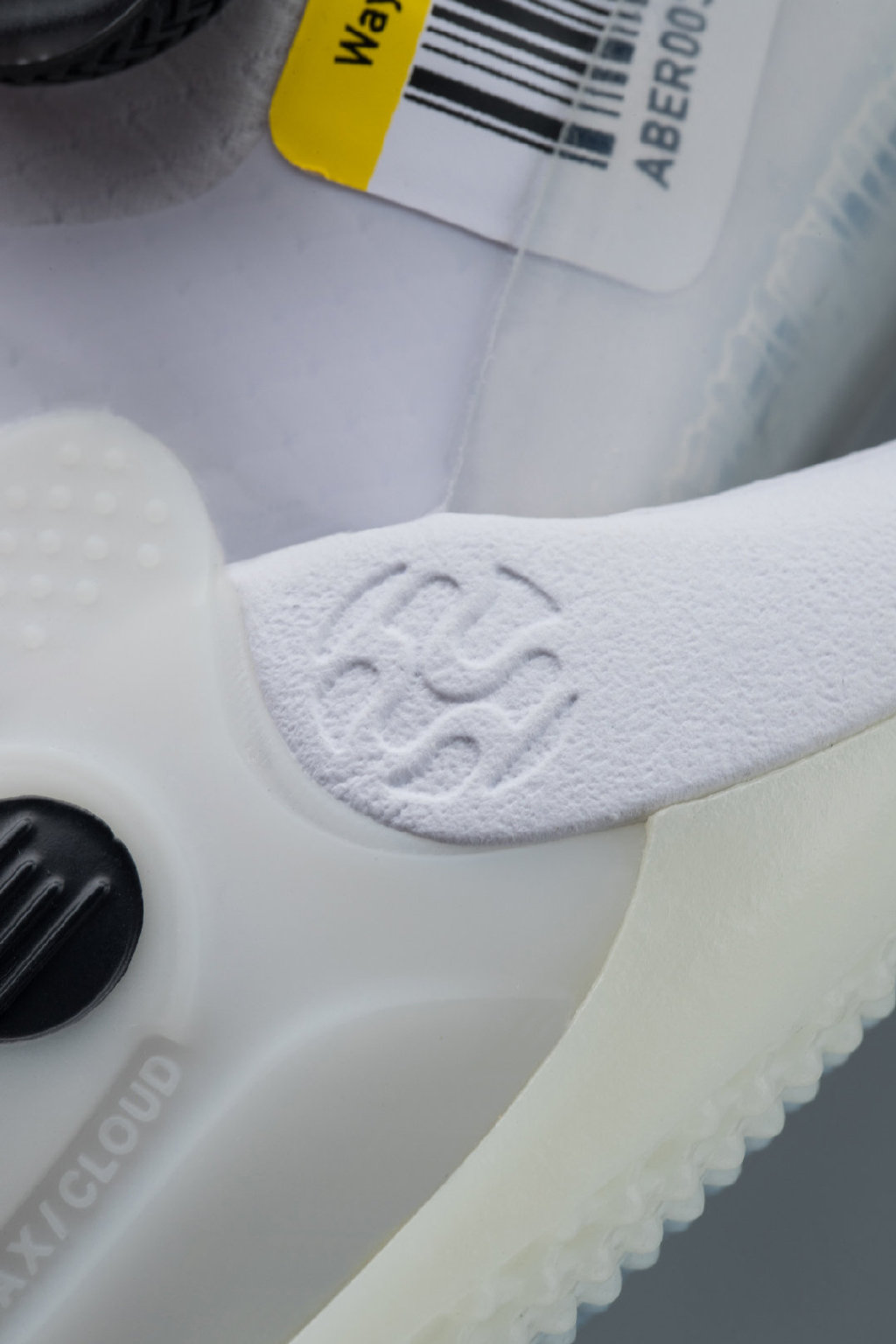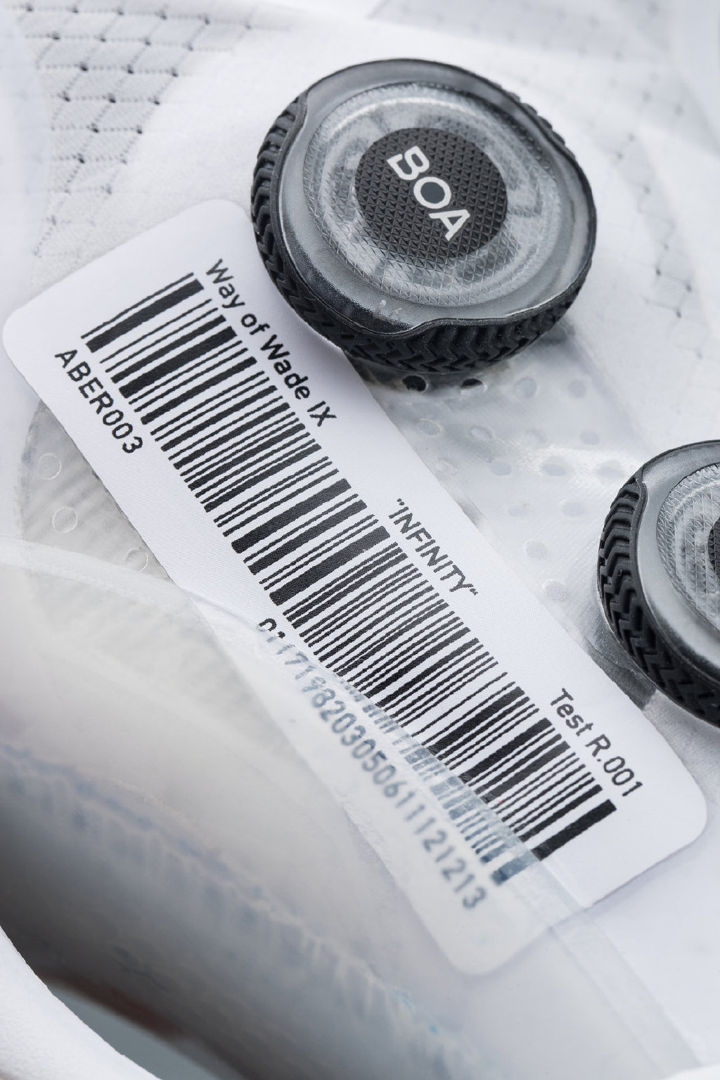 为突出「测试」主题,鞋面保留了鞋款名、编号、条形码等不少工业测试样品中的细节。