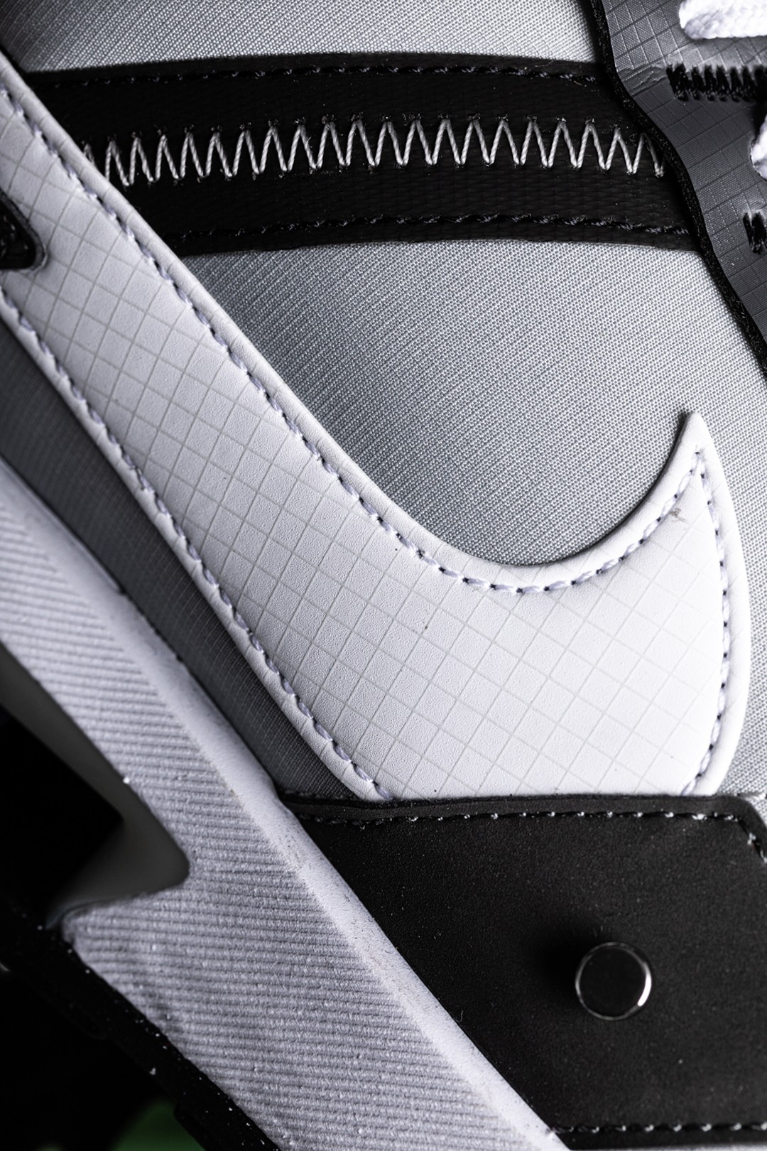 侧身处的 Swoosh Logo 以白色方格图案打造,搭配上灰色的鞋身视觉效果十分和谐。