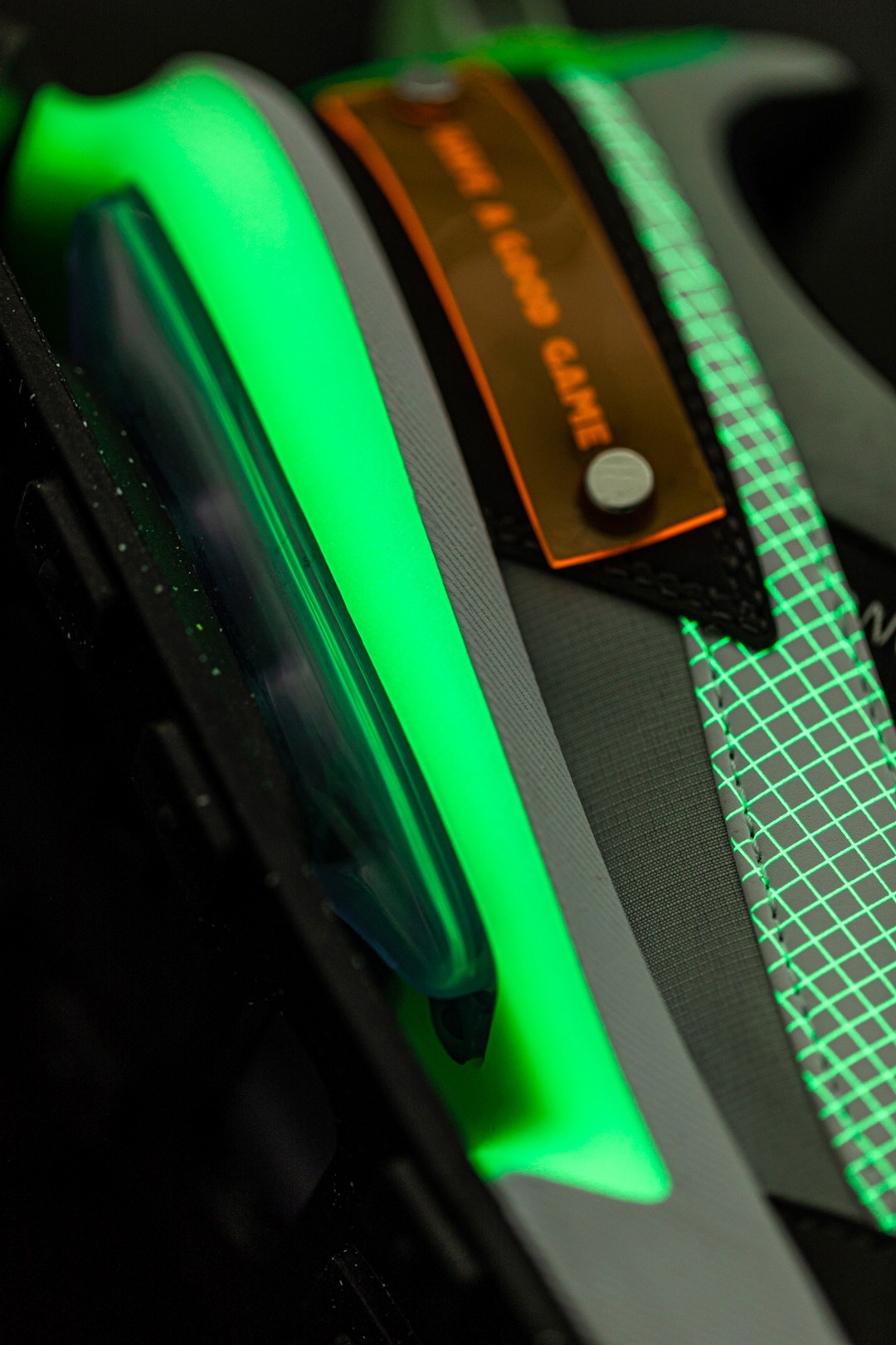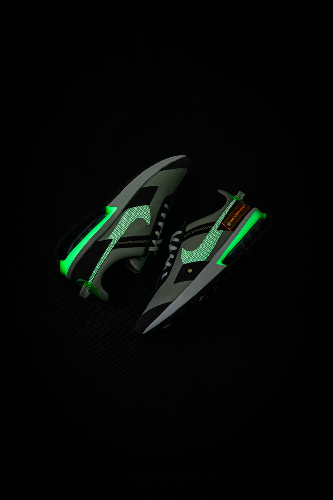 而这双鞋的诚意还不止于此,鞋身还带有大面积的夜光效果,无论是鞋舌、后跟还是 Swoosh Logo,甚至于后跟的橙色妆点,都能黑夜中放出光芒,让你成为街上最靓的崽。