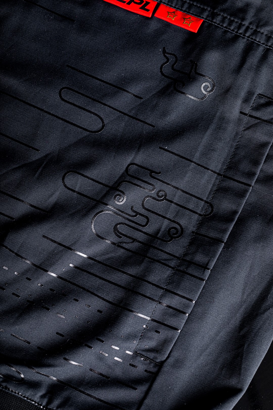 配色上选择了最为百搭的黑色呈现,正面下摆的热压祥云图案营造出浓郁的中国风,扎实的面料在秋冬时的实用性也超强。