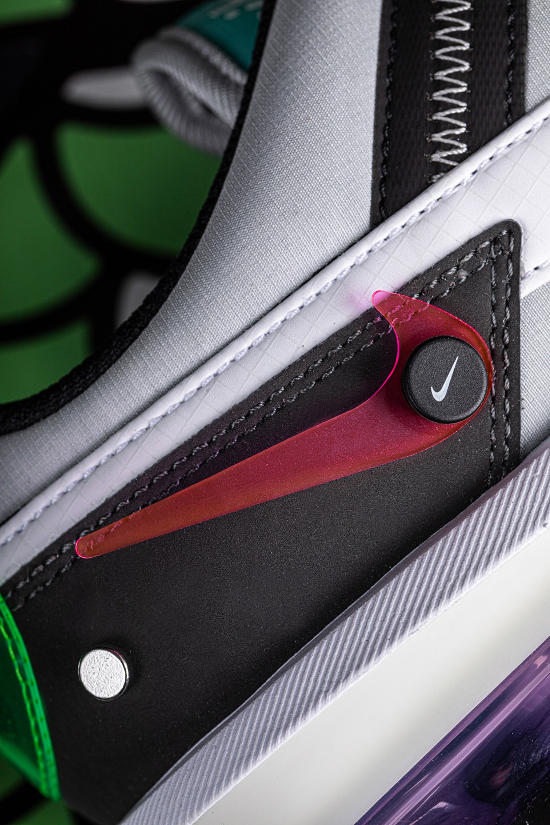 可以使用随鞋附赠的配件,将其更换为粉色的 Swoosh Logo,并盖上带有 mini Swoosh 的黑色纽扣,直接将可玩性提升了一个档次。