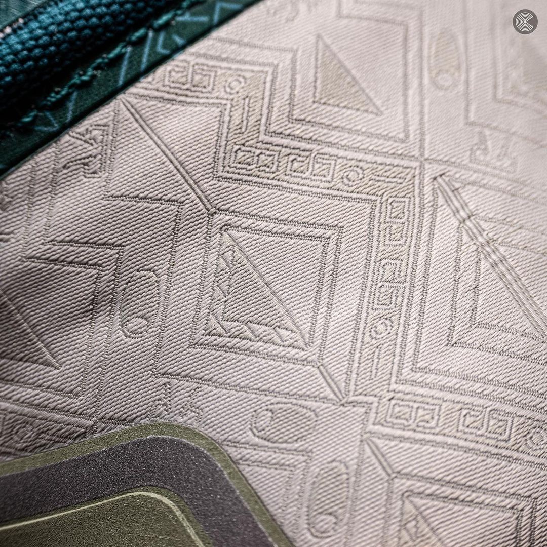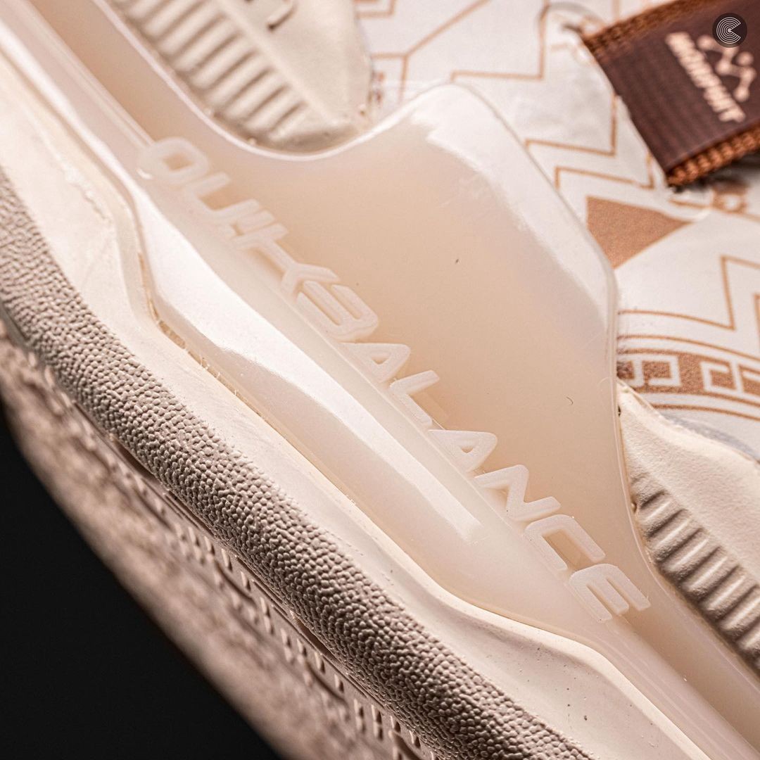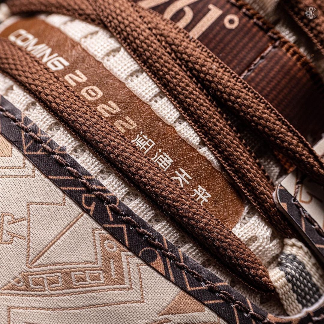 鞋面材质区别于以往的高密度织物,选择了带有「杭罗」样式的刺绣花纹织物打造,大幅度的提升了规格。
