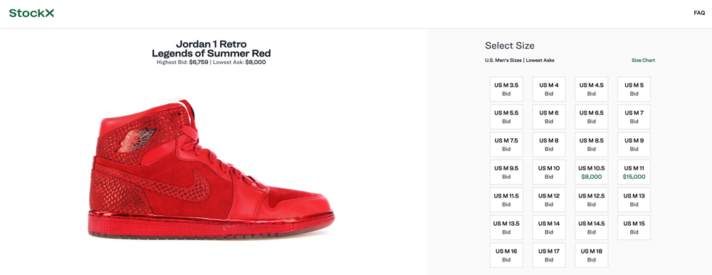 其中塔克上脚的这双 Air Jordan 1 现在 StockX 上只有 US 10.5 和 US 11 两个尺码,分别为 $8000 美元和 $15000 美元,最便宜的折合人民币大概在¥52000 元左右。