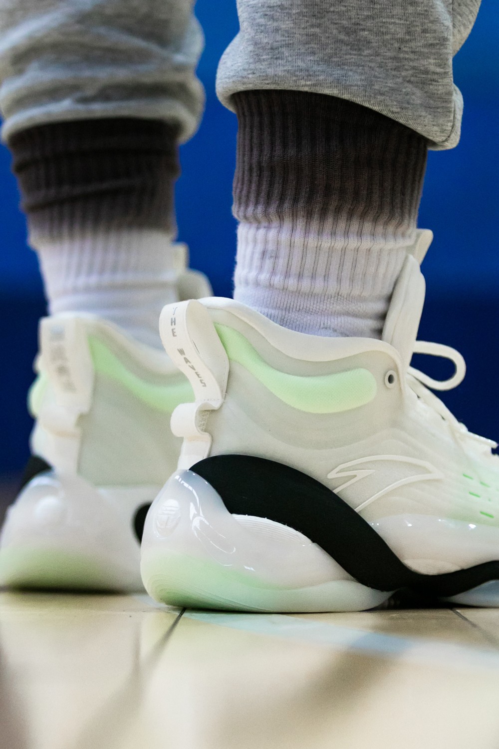 细节刻画方面,一眼醒目的当然是鞋舌上的圆形闪卡,可以呈现「安踏 Logo」、「汤普森 Logo」以及「11」字样。