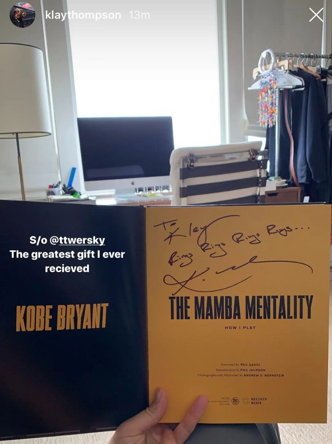 这一出处来自于科比赠予克莱的亲签《曼巴精神:科比自传》,上面带有「Rings Rings Rings」的寄语。