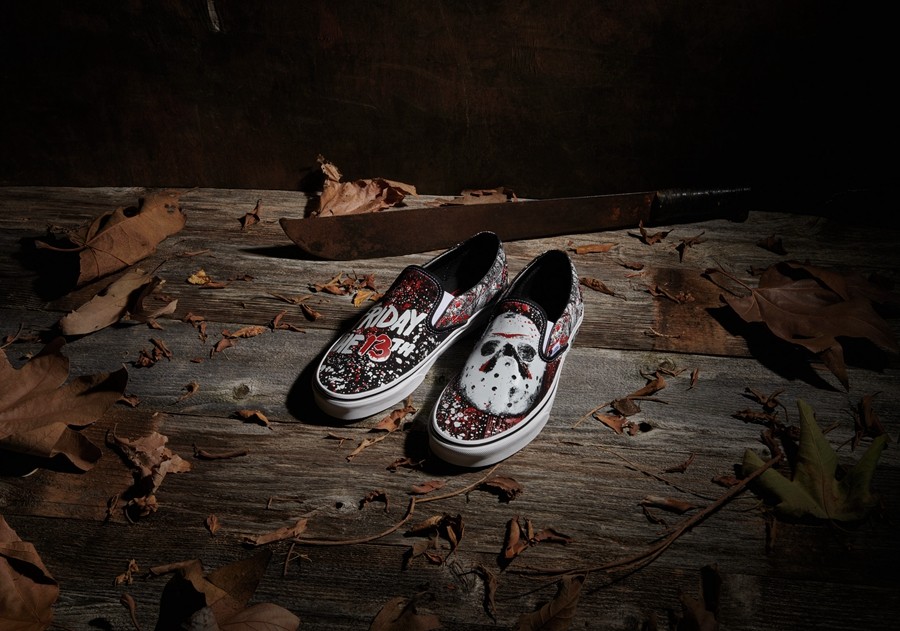 最后一双,采用 Slip-On 鞋款,将《黑色星期五》的恐怖的面具造型和 “Friday the 13th” 字样印在两只鞋上,不禁让人回想起电影中的情节。