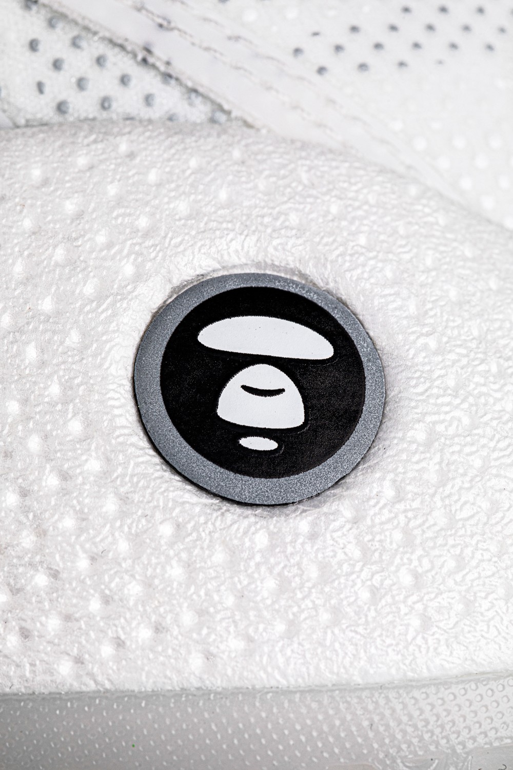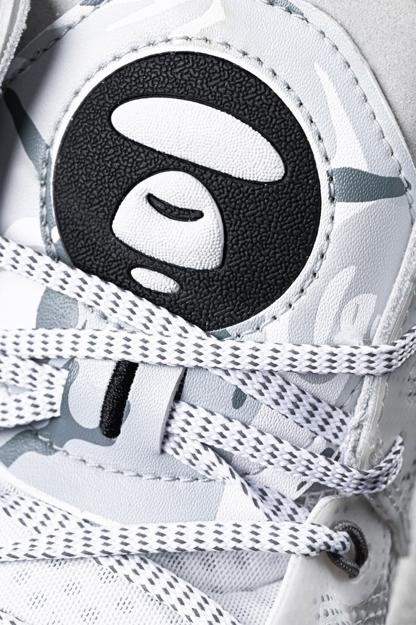 鞋舌 AAPE 猿人 Logo、鞋头 AAPE 字样以及后跟内侧的卡通标志,彰显联名身份的同时,更使其拥有着不同以往的潮流属性,令人过目不忘。