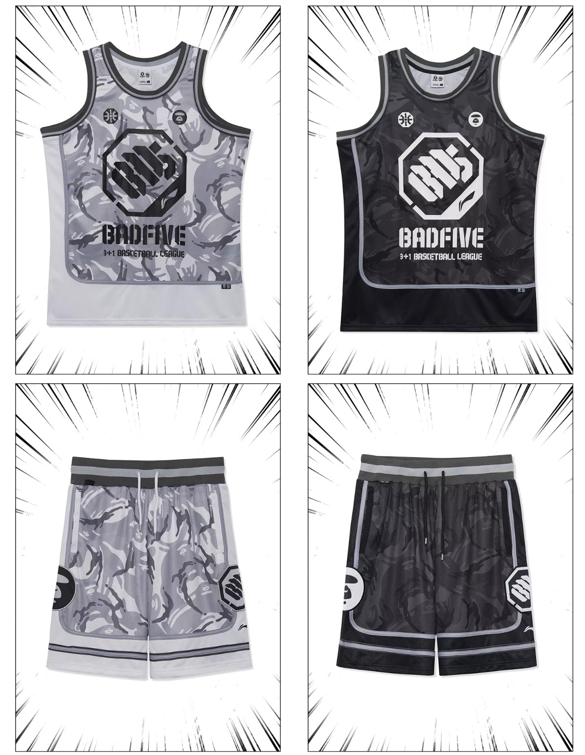 除此之外,本次双方还带来同主题反伍比赛套装,延续标志性迷彩装扮为主调,细节注入BADFIVE Logo 与猿人头标志彰显特殊身份。