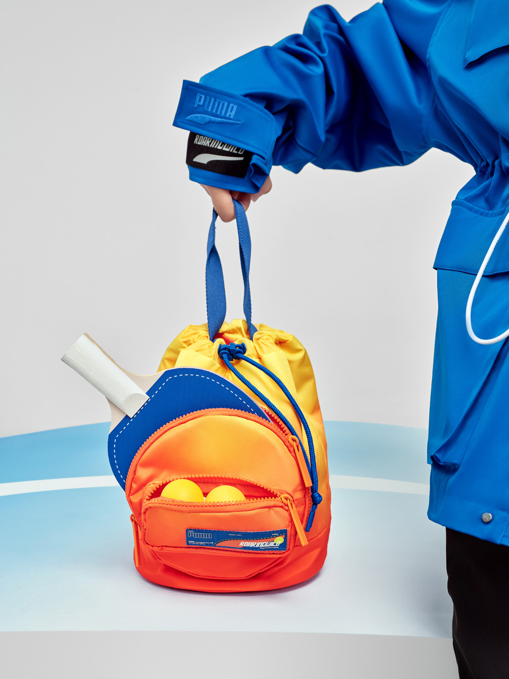 水桶包以乒乓球标志性的高饱和度橘色和明黄色渐变作为视觉亮点,造型可爱还有多口袋的设计满足各种收纳需求。