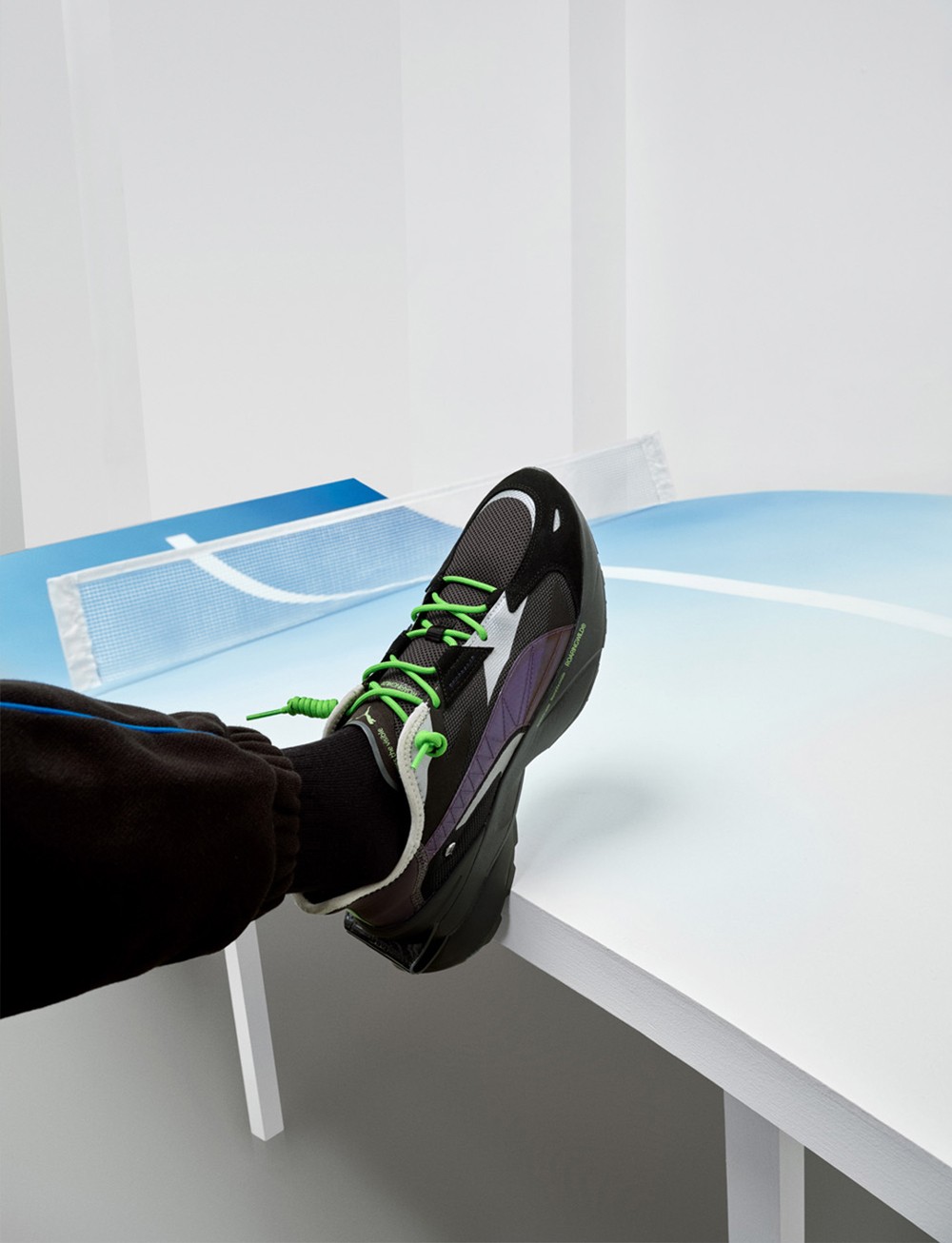 巧妙地在中底处辅以类似乒乓球拍的橡胶材质,从而突显此番联名的精神内涵,将乒乓运动元素融入日常穿搭。