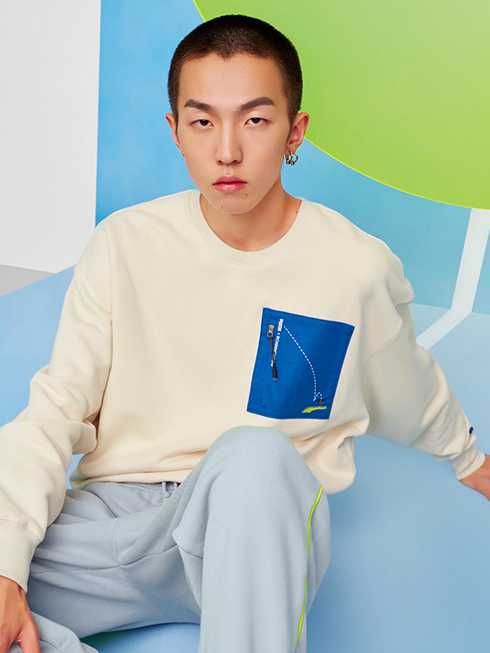 乳白色圆领卫衣上的亮蓝色口袋格外吸睛,还将具有动感的乒乓球弧线巧妙融入。