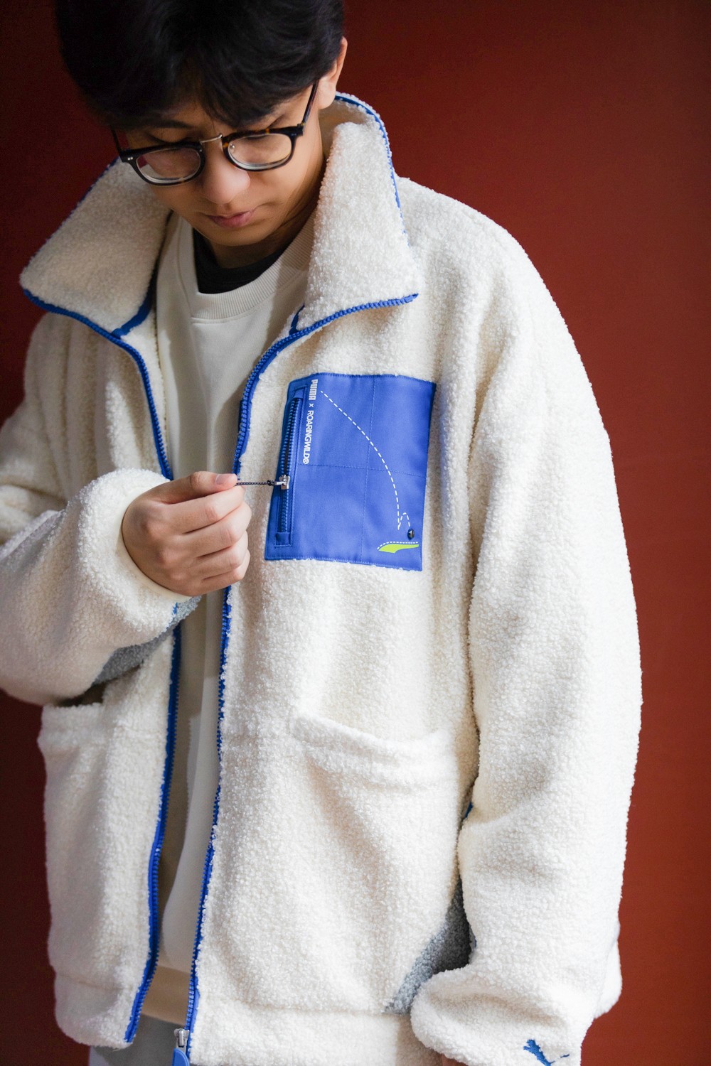 白色羊羔绒外套冬天穿真的暖和,同样点缀有亮蓝色口袋,PUMA 的经典款型玩味呈现,颜值、设计、功能性一样不落。