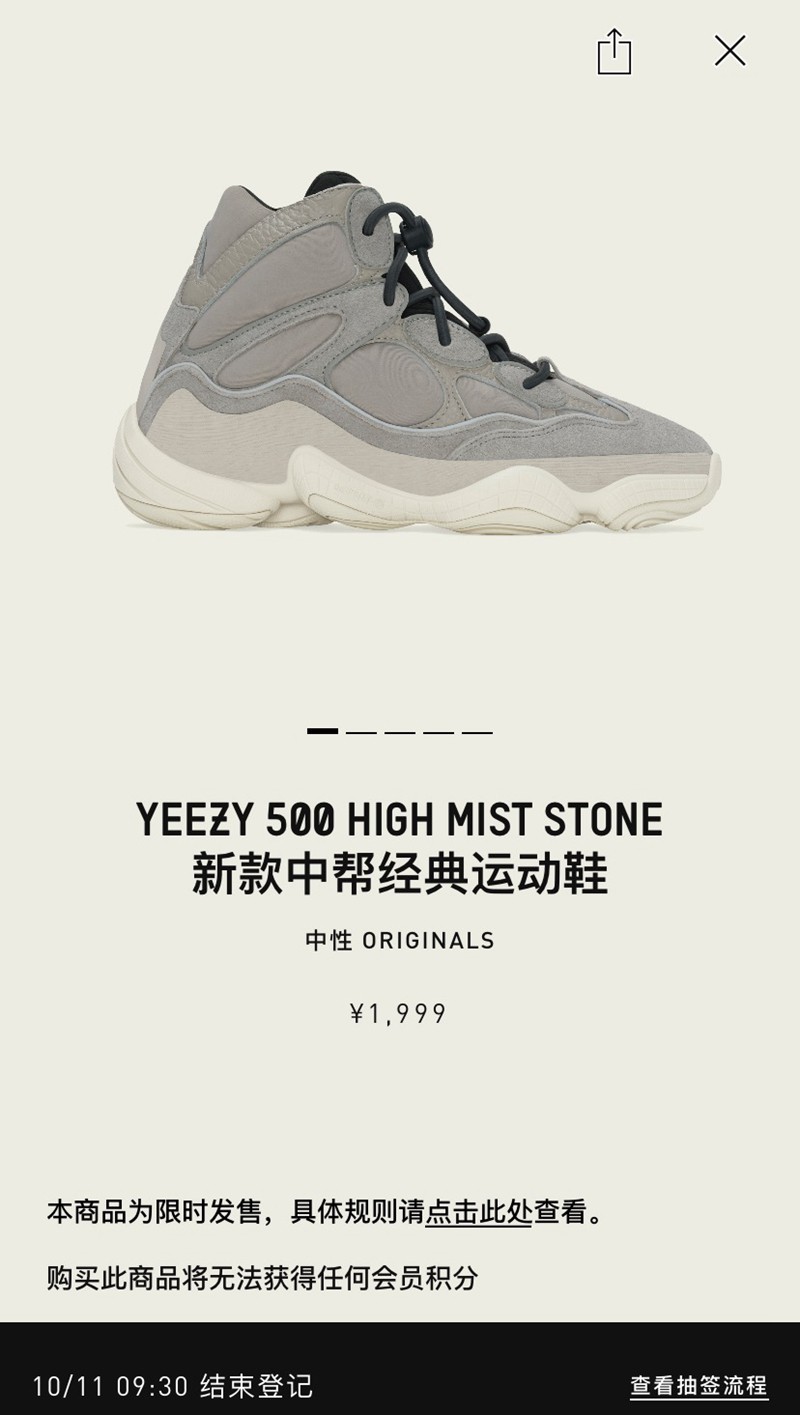 据悉,adidas Originals Yeezy 500 HIGH MIST STONE 官方定价为 ¥1999 元,并且将于 10 月 11 日在 adidas CONFIRMED APP、官方微信小程序、线下门店以及指定零售商发售。