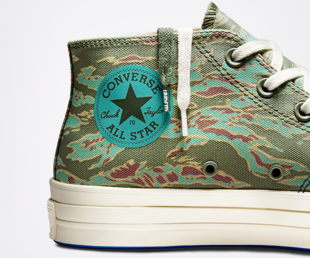 此次联名共推出了一绿一黄两款配色,并且均有相对冷门的中帮版本 Converse Chuck 70 为蓝本进行创作。