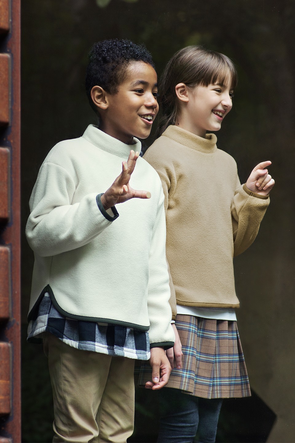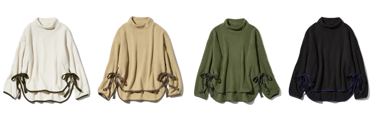 定价 ¥199 RMB 的飘带摇粒绒半高领套头衫,下摆两侧飘带绝对是这件的点睛之笔,系成蝴蝶结造型俏皮可爱,同时还可调节松紧,变换不同造型,一举多得。