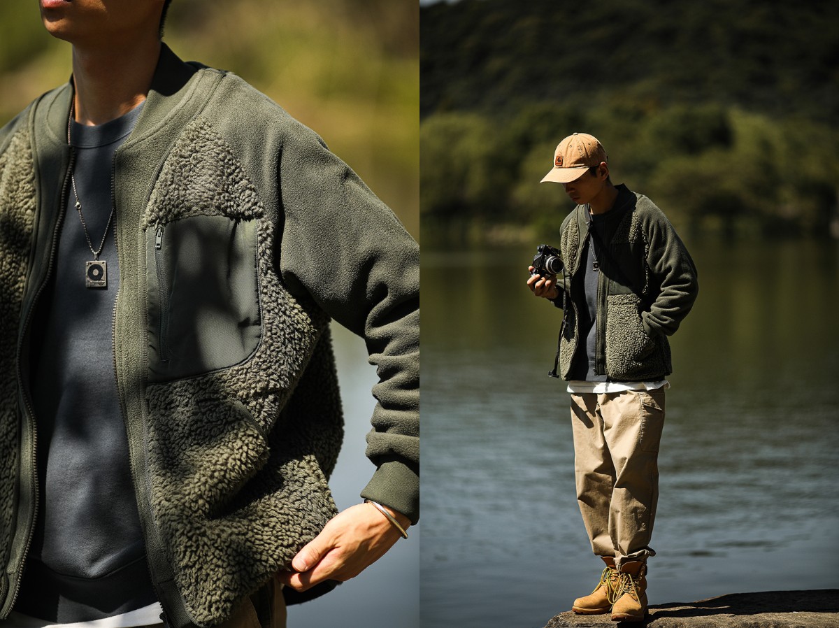 有着飞行员夹克与背心叠加设计的摇粒绒宽松外套,释放出更具视觉层次的军事机能感。