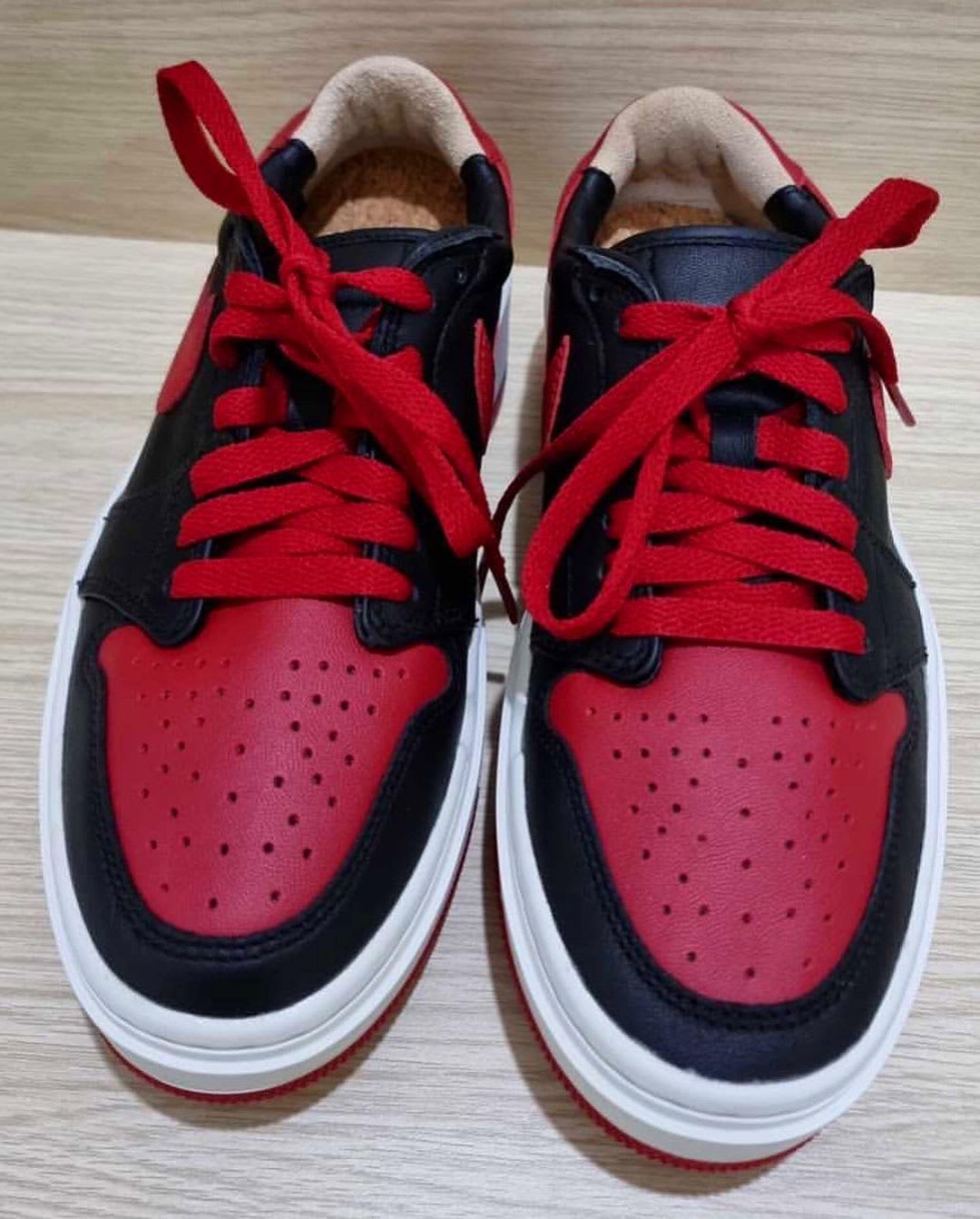低帮鞋型搭配正宗的黑红配色看起来还算正常,鞋面采用柔软的皮革材质,而且还内置软木塞鞋垫,用料规格不低。