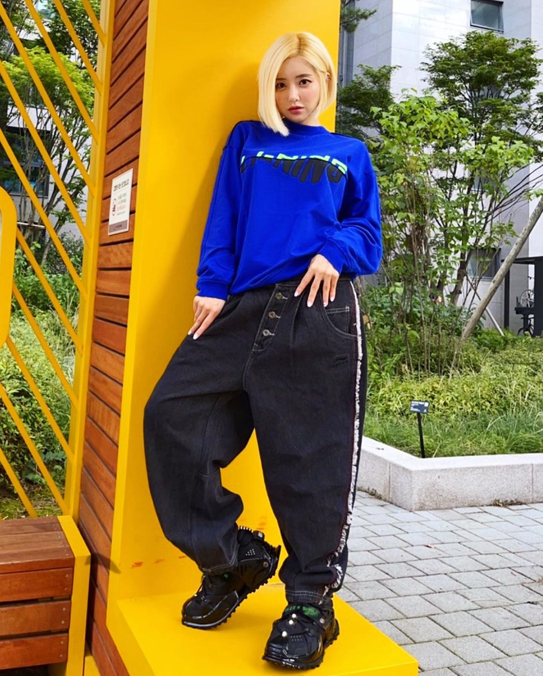 醒目的蓝色宽松卫衣搭配廓形牛仔裤,与颇具机能感的鞋型呼应,形成兼具潮流颜值与复古的视觉感受。