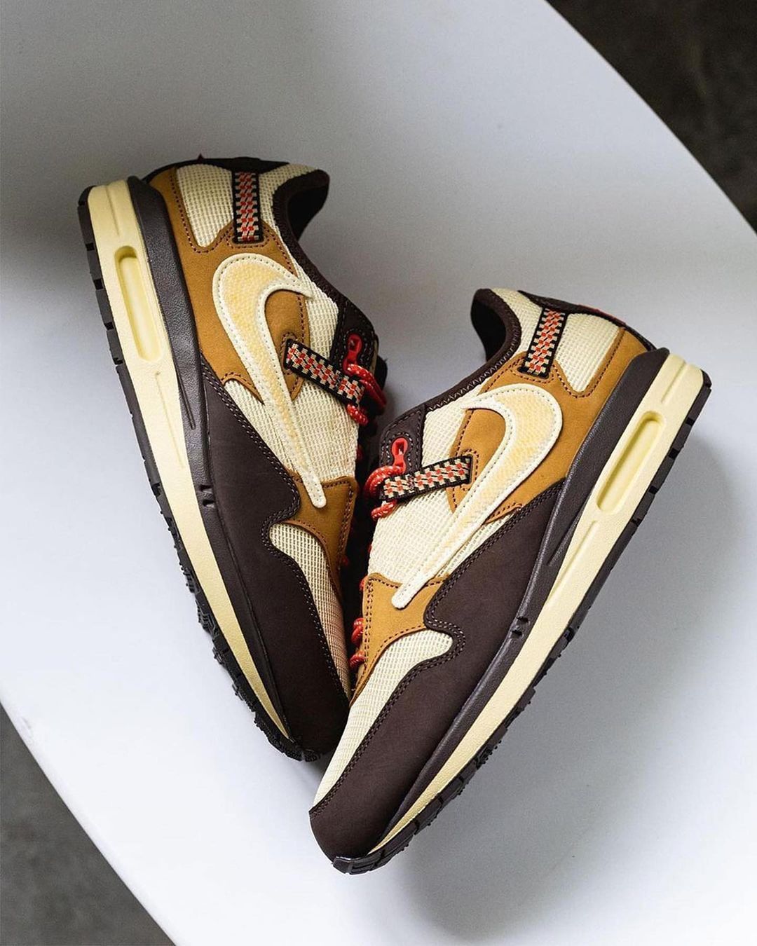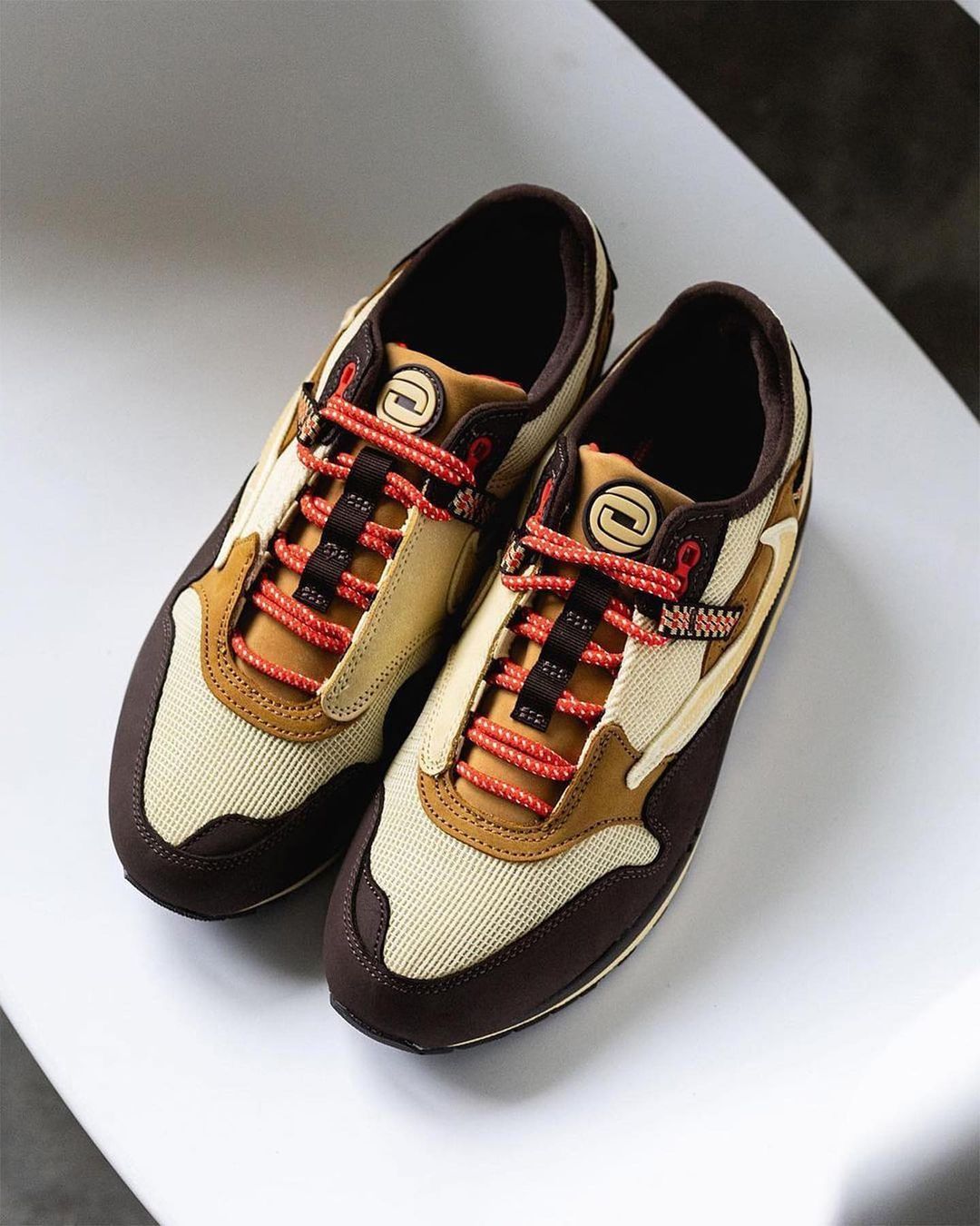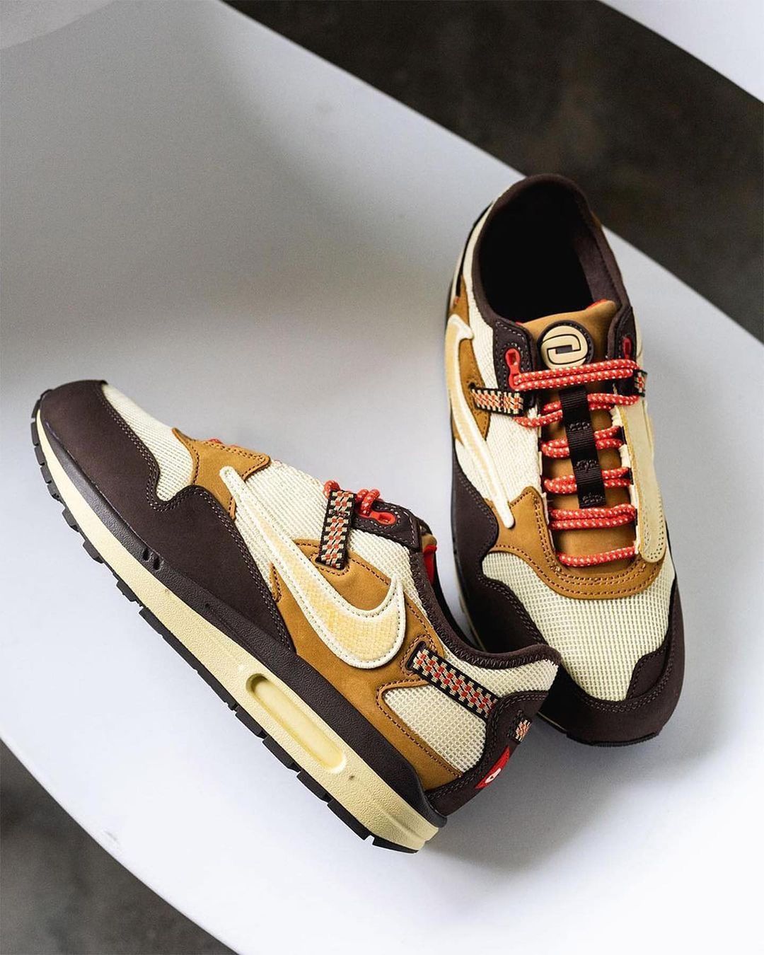 依旧是百试不爽的倒钩 Swoosh 为核心,加之 Travis Scott 本人最爱的大地色系装扮,重新演绎 Air Max 1 这一经典鞋型。