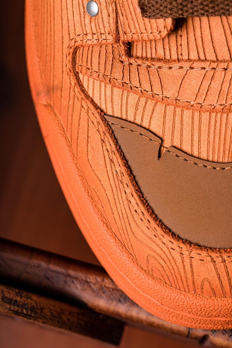 最大的亮点就在于鞋面通体都采用了镭射工艺来还原木头的纹理,用手触摸可以感受到立体的效果。