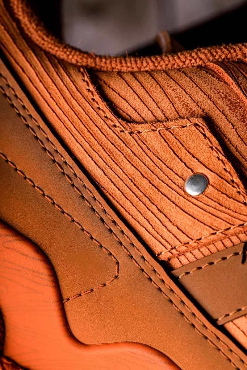 另外在鞋面拼接处加入了金属铆钉的设计,来还原木板拼接处钉子的模样。