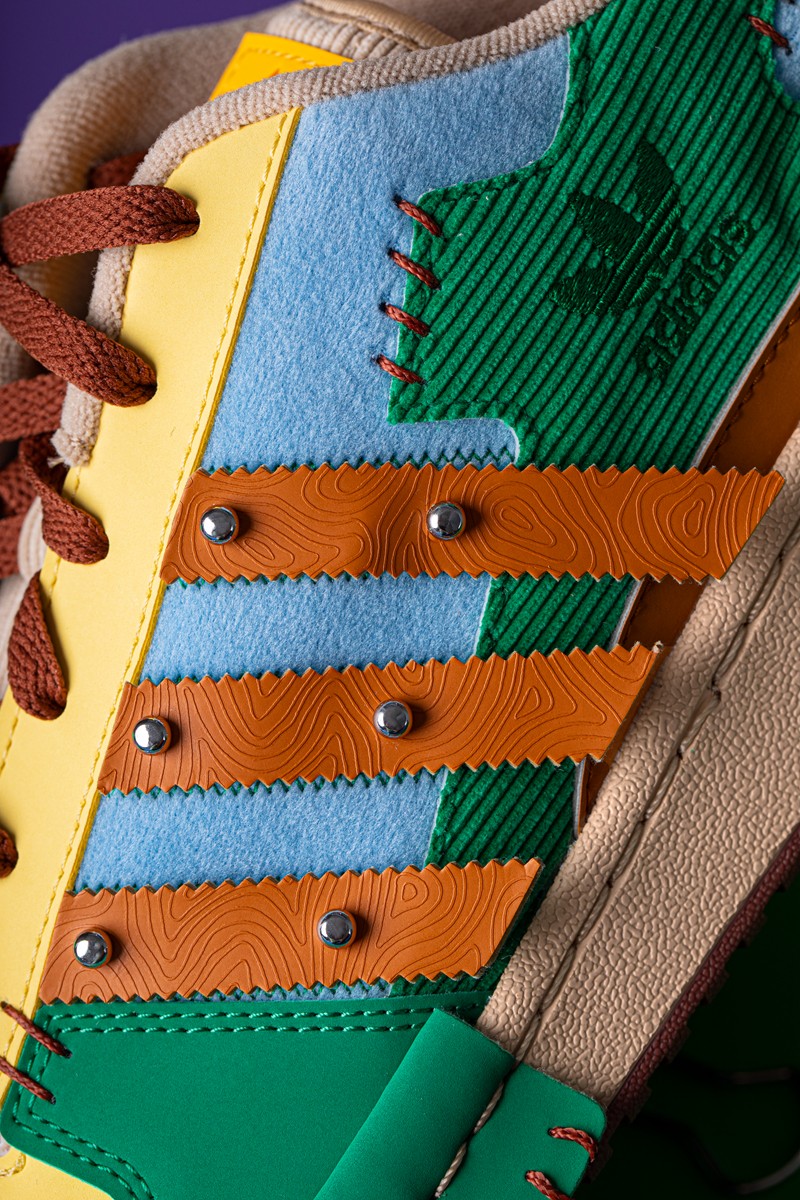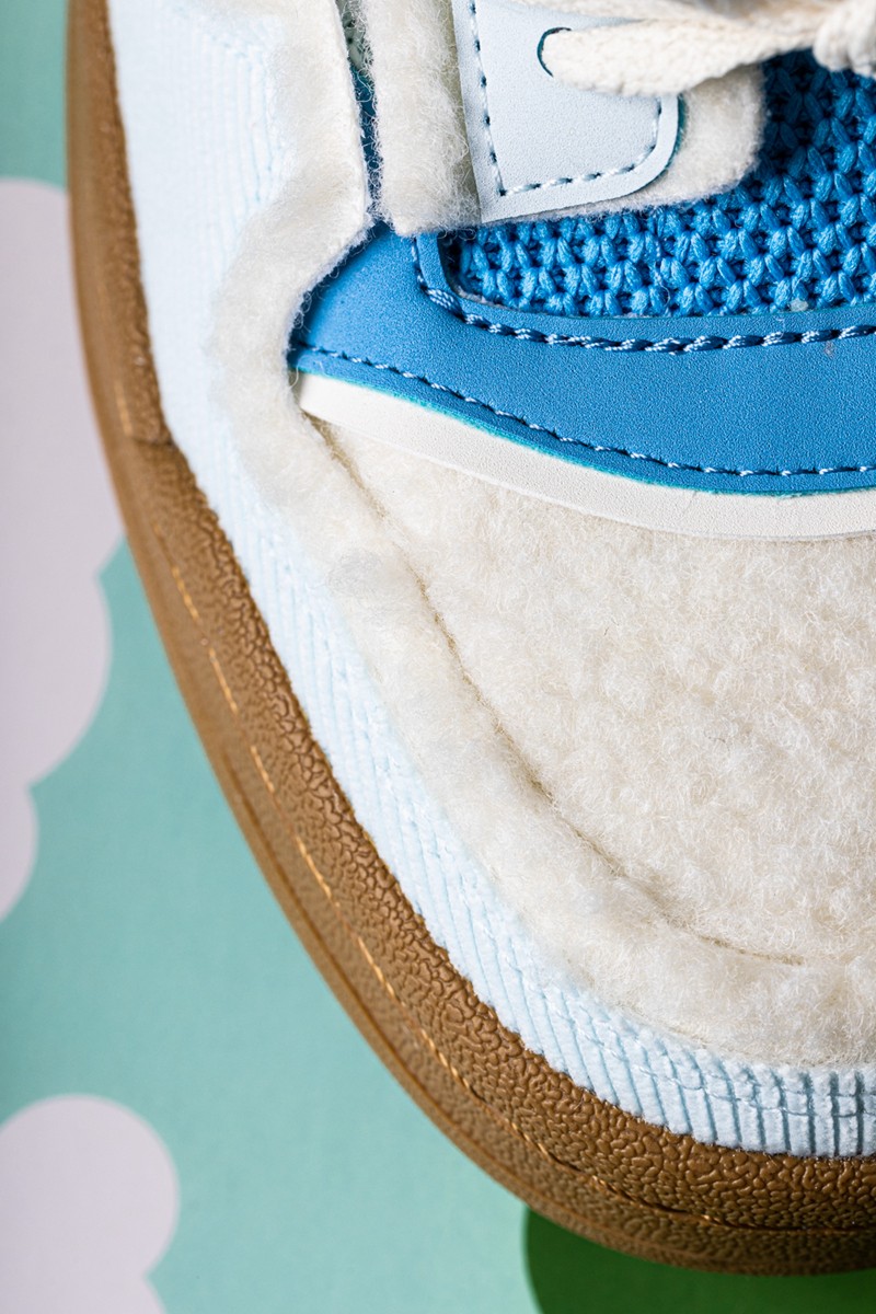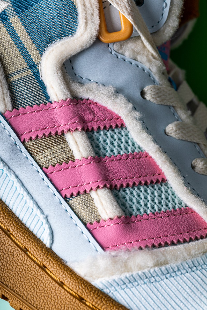 鞋款的设计更有趣,整体以高帮 Forum 为蓝本,依旧采用丰富的材质打造鞋面,帆布、灯芯绒、麂皮、羊绒等都包含其中。