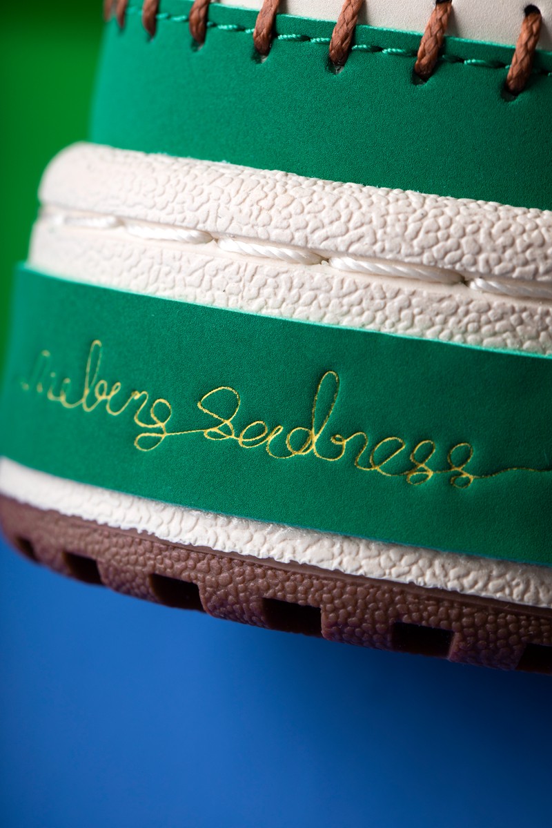 后跟处还追加了麂皮材质打造的贴布,并在上方印有 Melting Sadness 的 Logo,彰显联名身份。