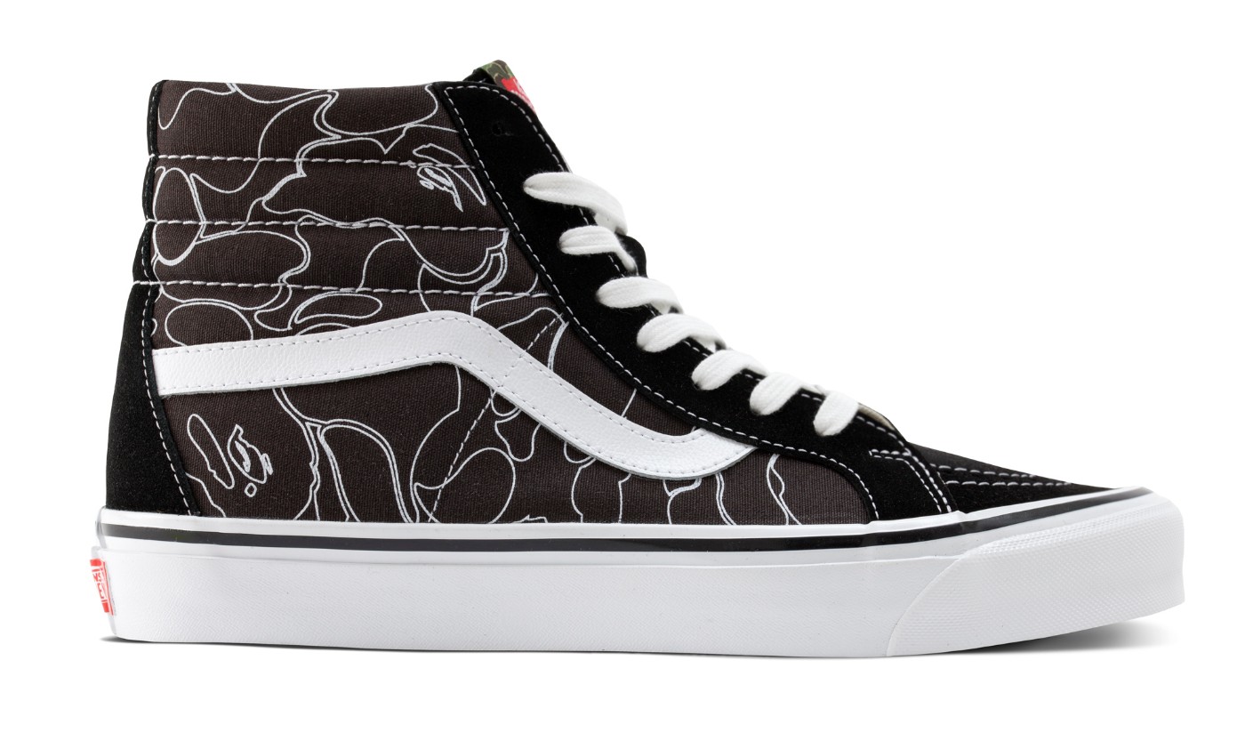 此次联名以 Vans 经典的 Sk8-Hi 和 Authentic 鞋型为蓝本,并融合 BAPE 标志性迷彩图案。