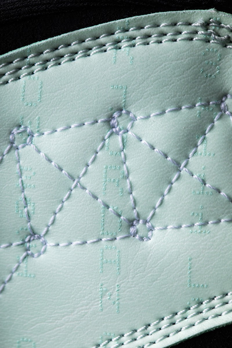 鞋身不同于传统 AJ13 的波点造型,而是采用几何车线连接,诠释此次电子科幻风格的主题,另外鞋面还有许多类似编码的暗纹。