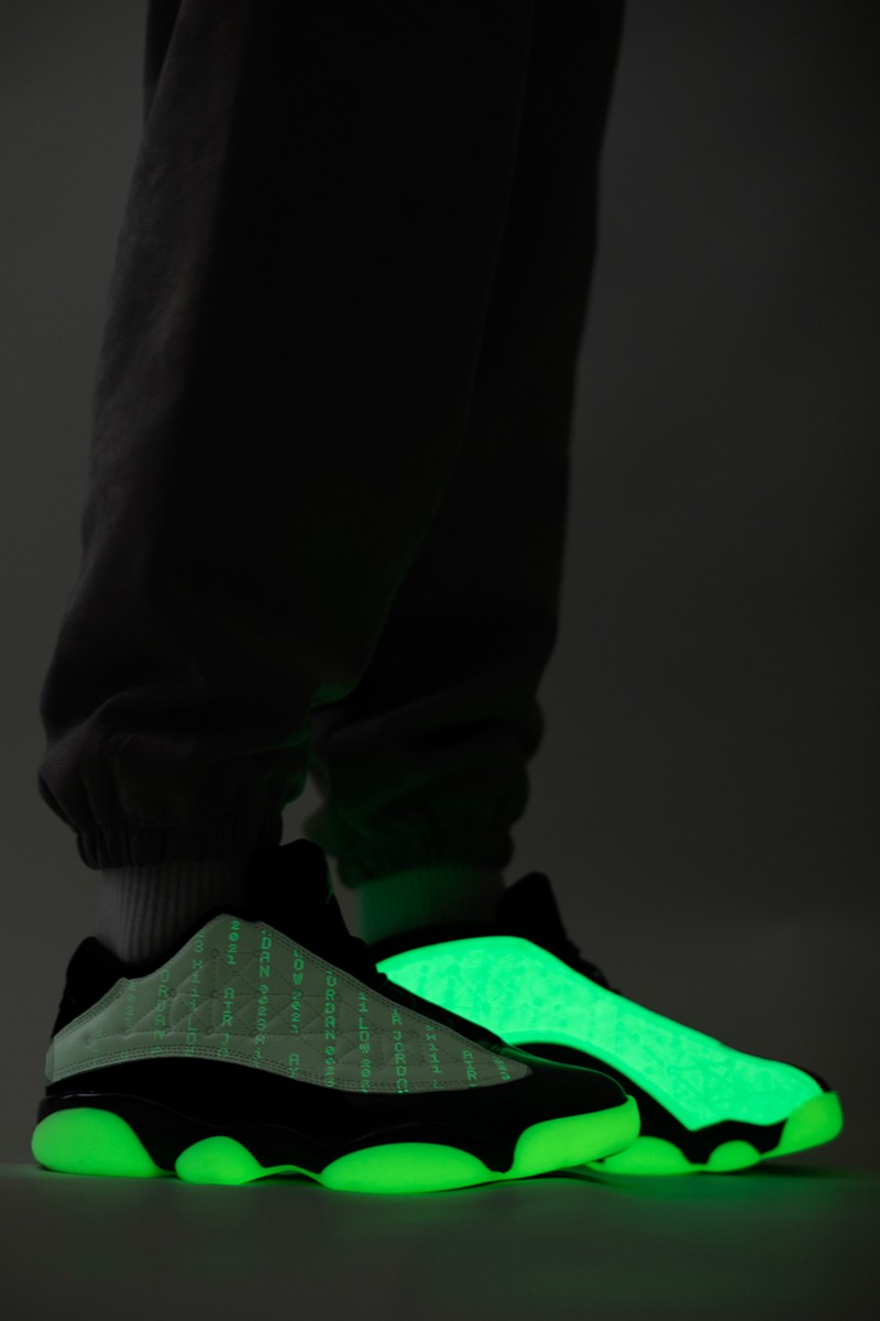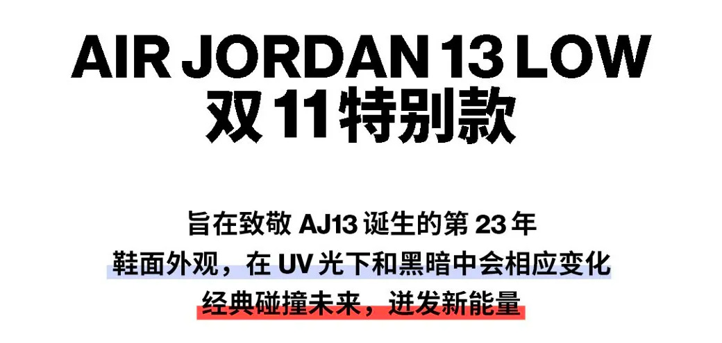 而今年也不例外,Jordan Brand 以 Air Jordan 13 Low 为蓝本打造了 2021 光棍节主题鞋款,并且加入了前所未有的 UV 反光新玩法!