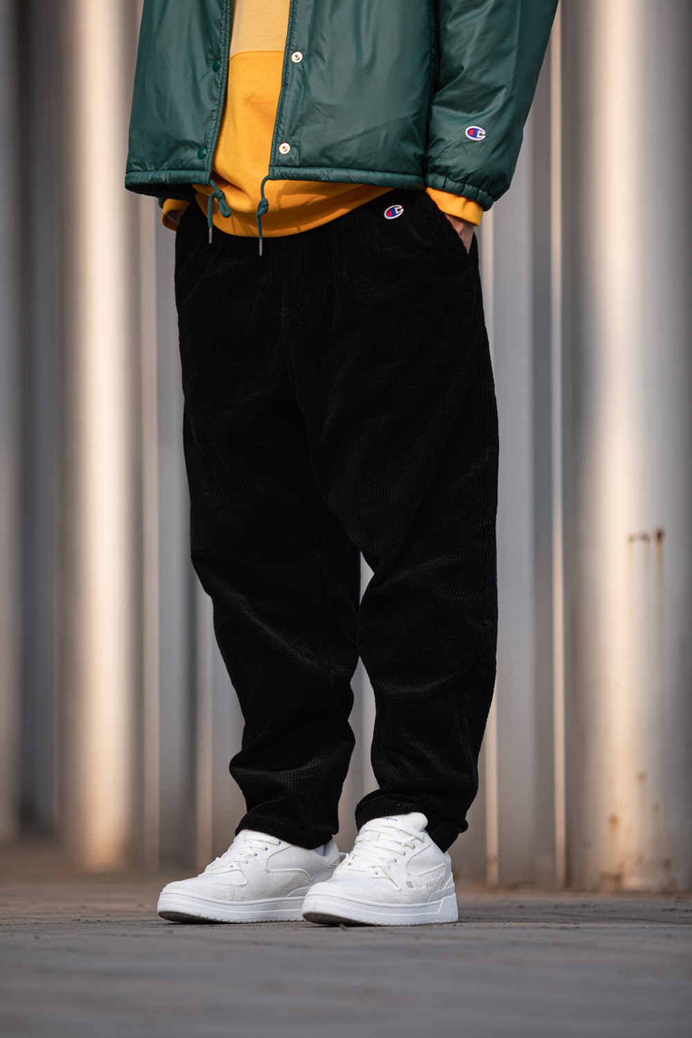 黑色灯芯绒长裤搭配纯白色皮质球鞋,耐看又时髦。