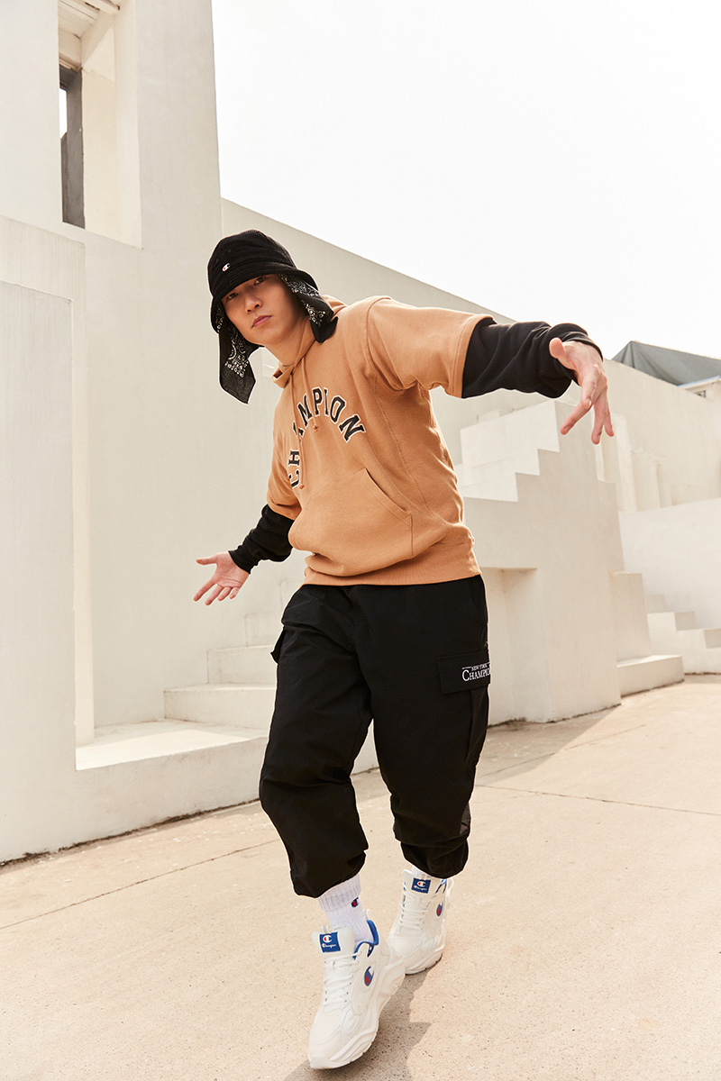 作为现代版连帽卫衣的发明者,《这!就是街舞4》的人气 B-Boy 乔治上身胸前带有 Champion 字母 Logo 的 Reverse Weave® 系列撞色拼接卫衣,可算是复古运动风最具代表性的精髓单品。完美解放运动中的束缚,造型经典、百搭、不挑人。