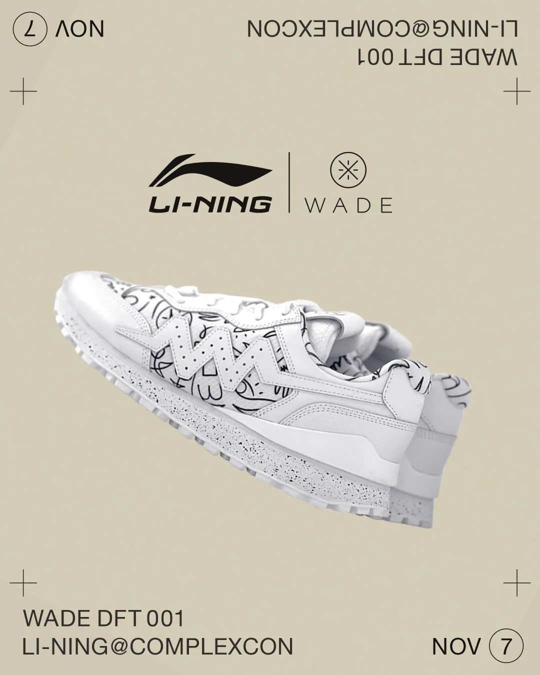 新一波韦德 x DFT 联名款也要来了,休闲跑鞋 WADE 001 鞋型,纯白底色上加入一笔画装扮。