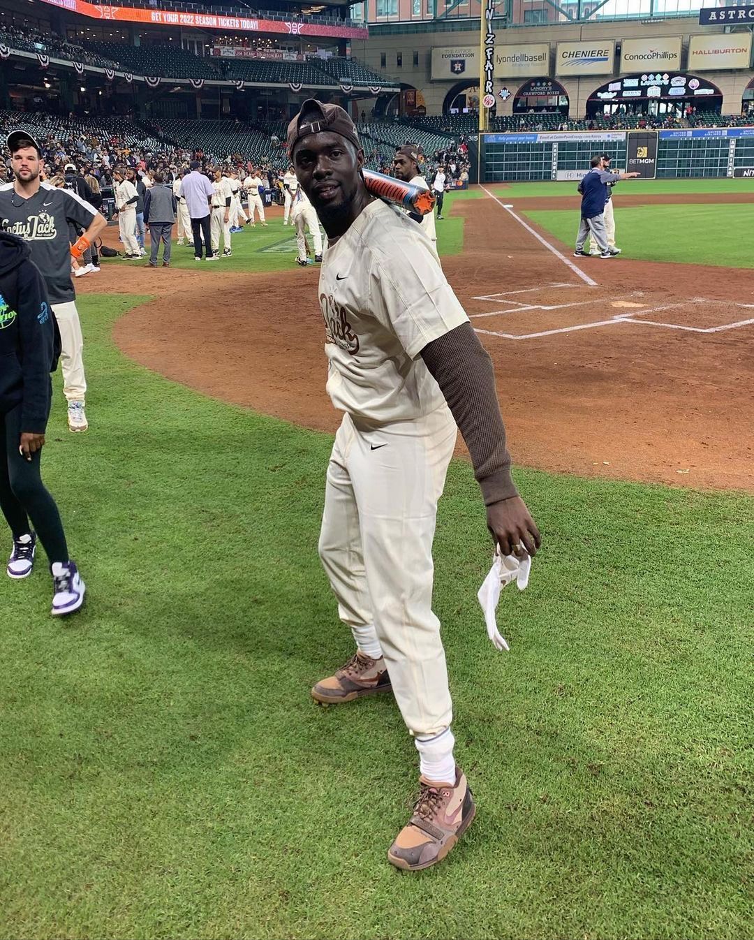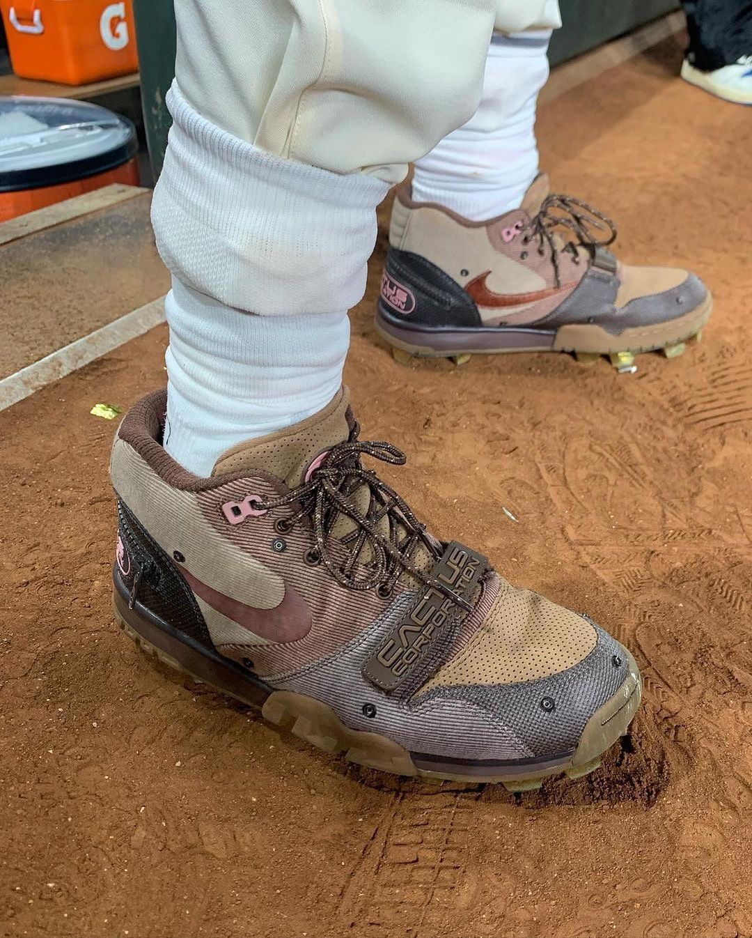 好友上脚此前曝光谍照的 Travis Scott x Nike Air Trainer 1 Mid,同样也是钉鞋版本,不过也可让我们近距离看清鞋面细节。