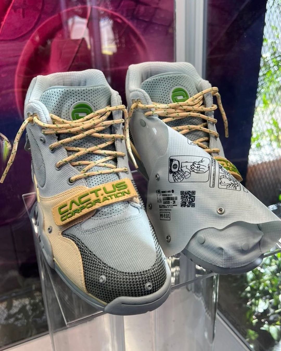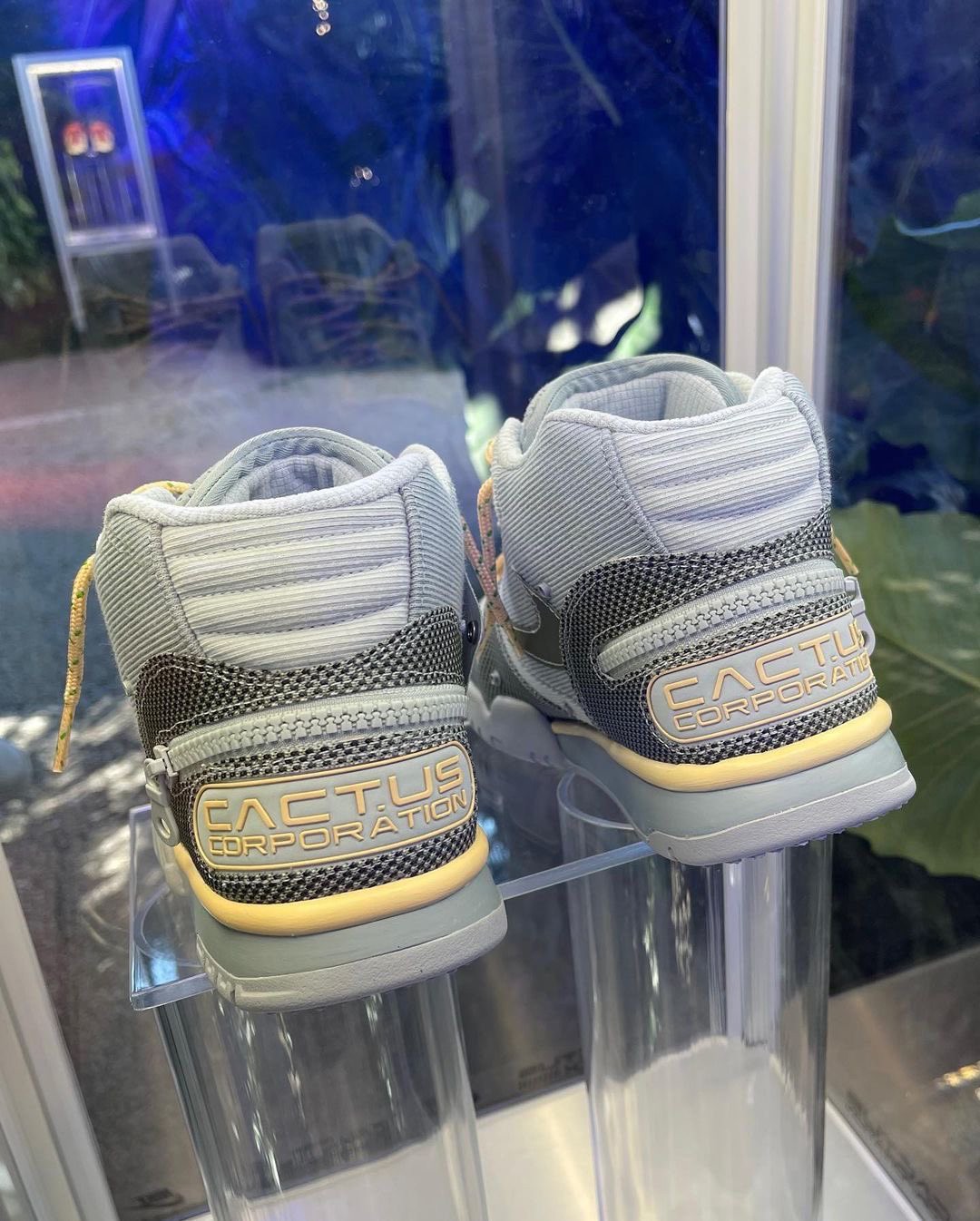 而在现场的展示橱窗中,此前 TS 上脚的常规球鞋版本实物现身,并且还曝光另外一双浅灰配色。