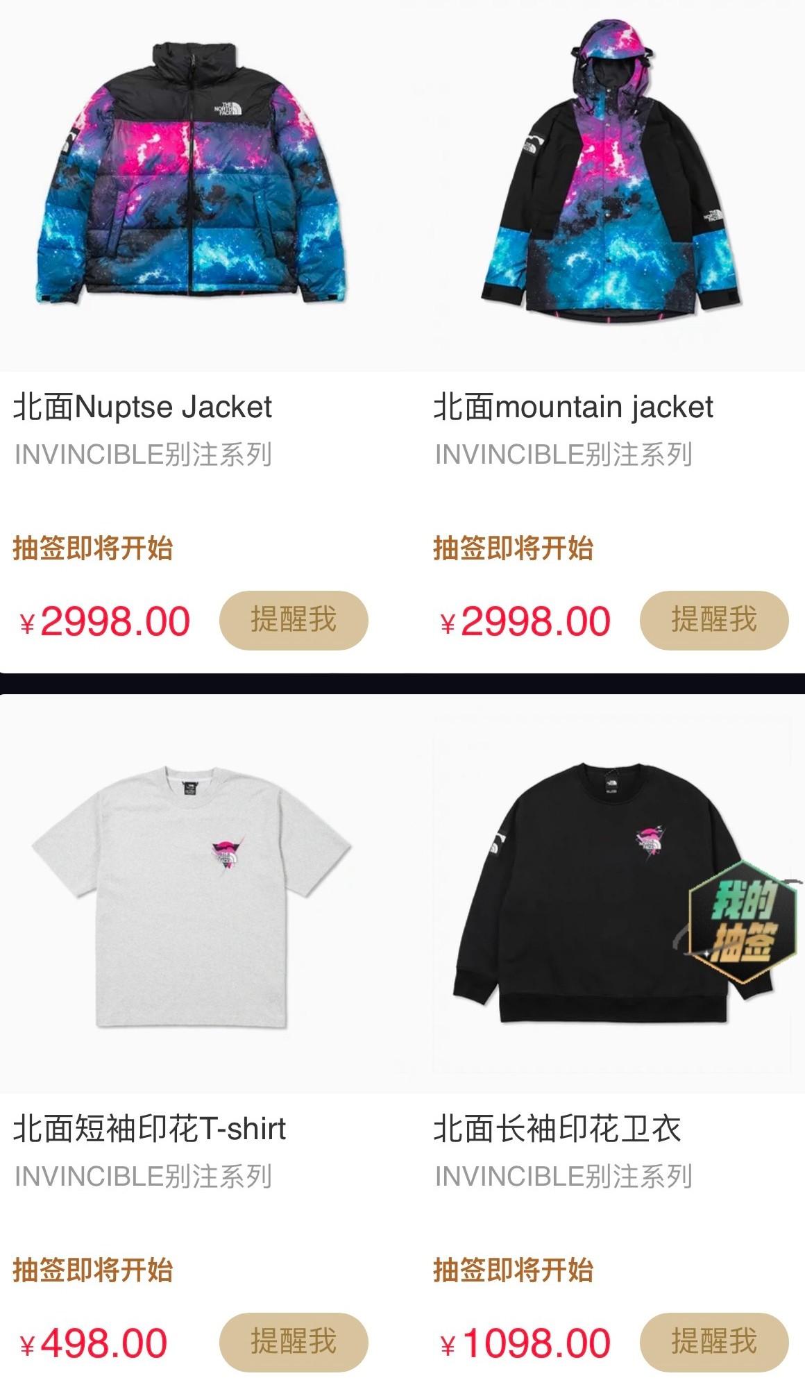Mountain Light Jacket 冲锋衣以及 Nuptse Jacket 羽绒服发售价格均为 ¥2998 元,长袖印花卫衣发售价格为 ¥1098 元,短袖 T 恤发售价格为 ¥498 元。