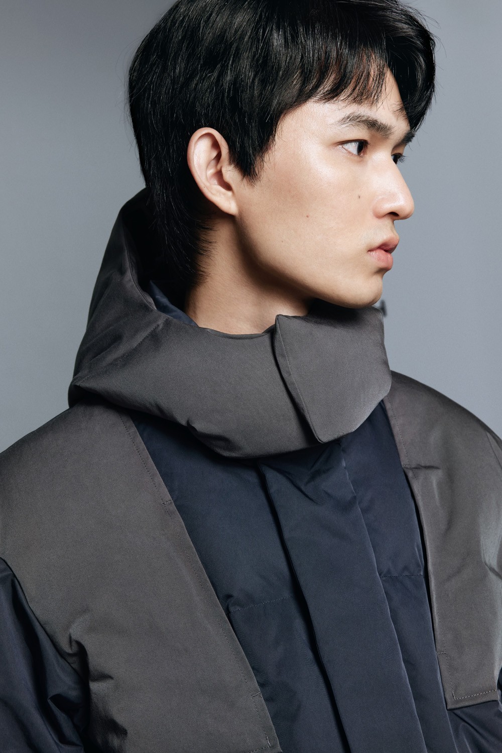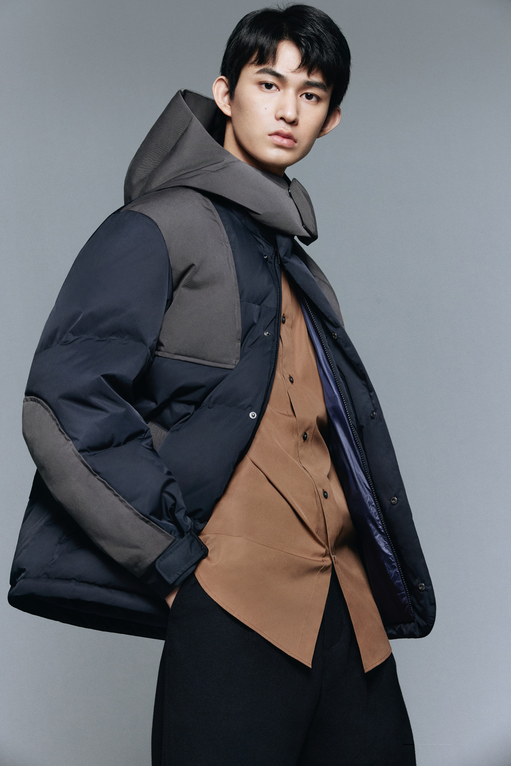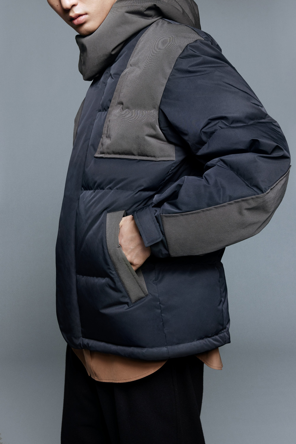 这种派克大衣式的羽绒服上身就不会显得臃肿,时下流行的力量感廓形剪裁还有几分机能感,这也是 +J 首次推出机能风拼接款设计。