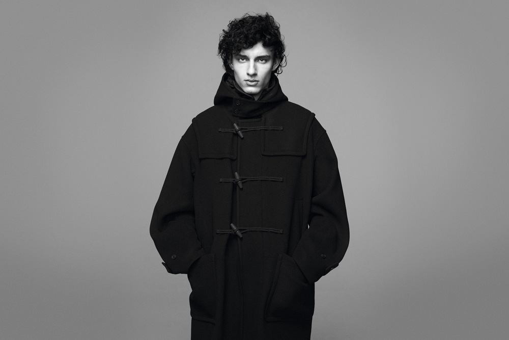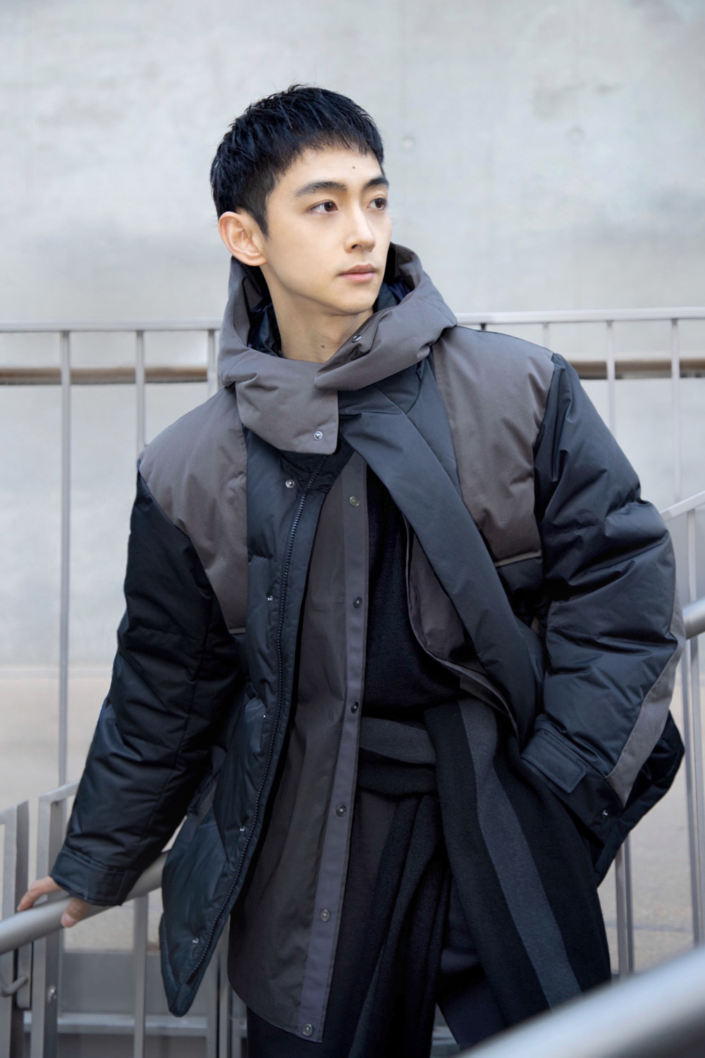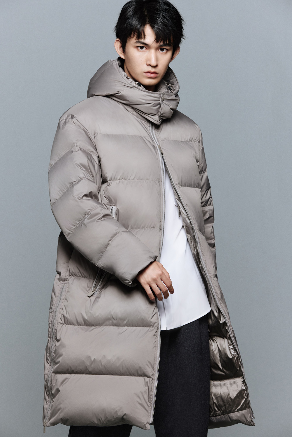 这种派克大衣式的羽绒服上身就不会显得臃肿,时下流行的力量感廓形剪裁还有几分机能感,这也是 +J 首次推出机能风拼接款设计。