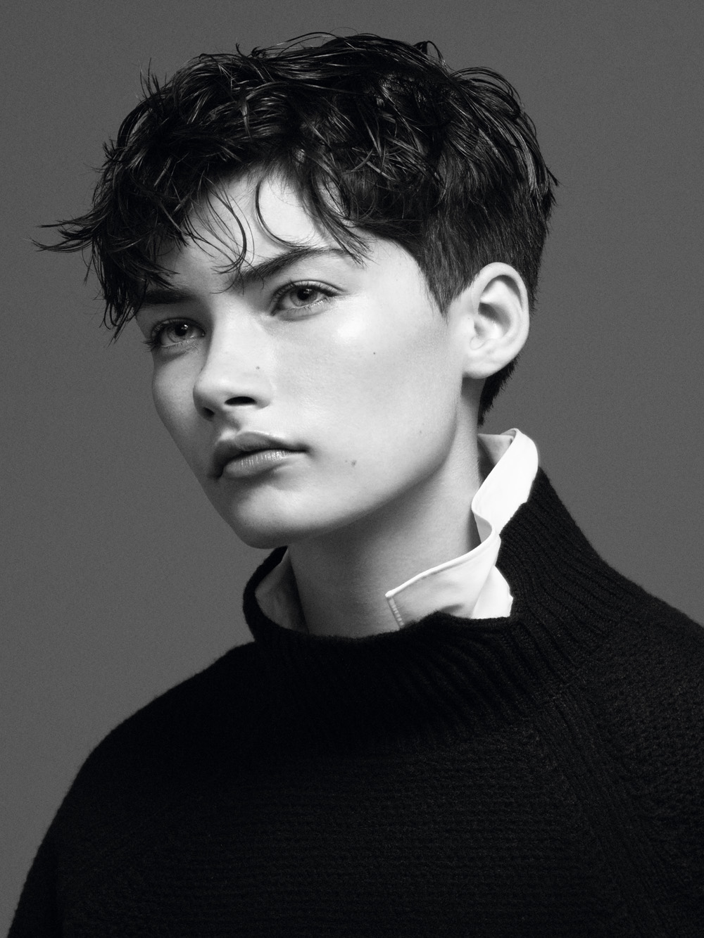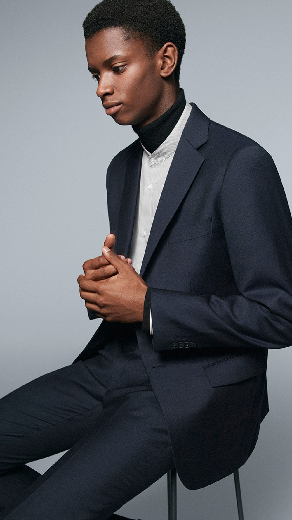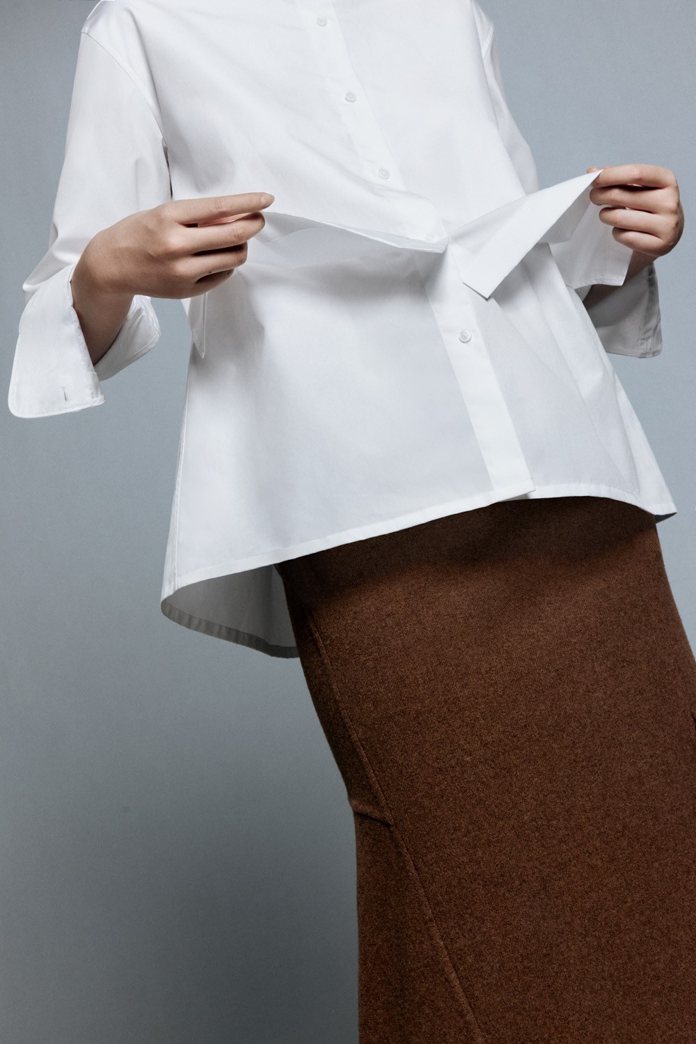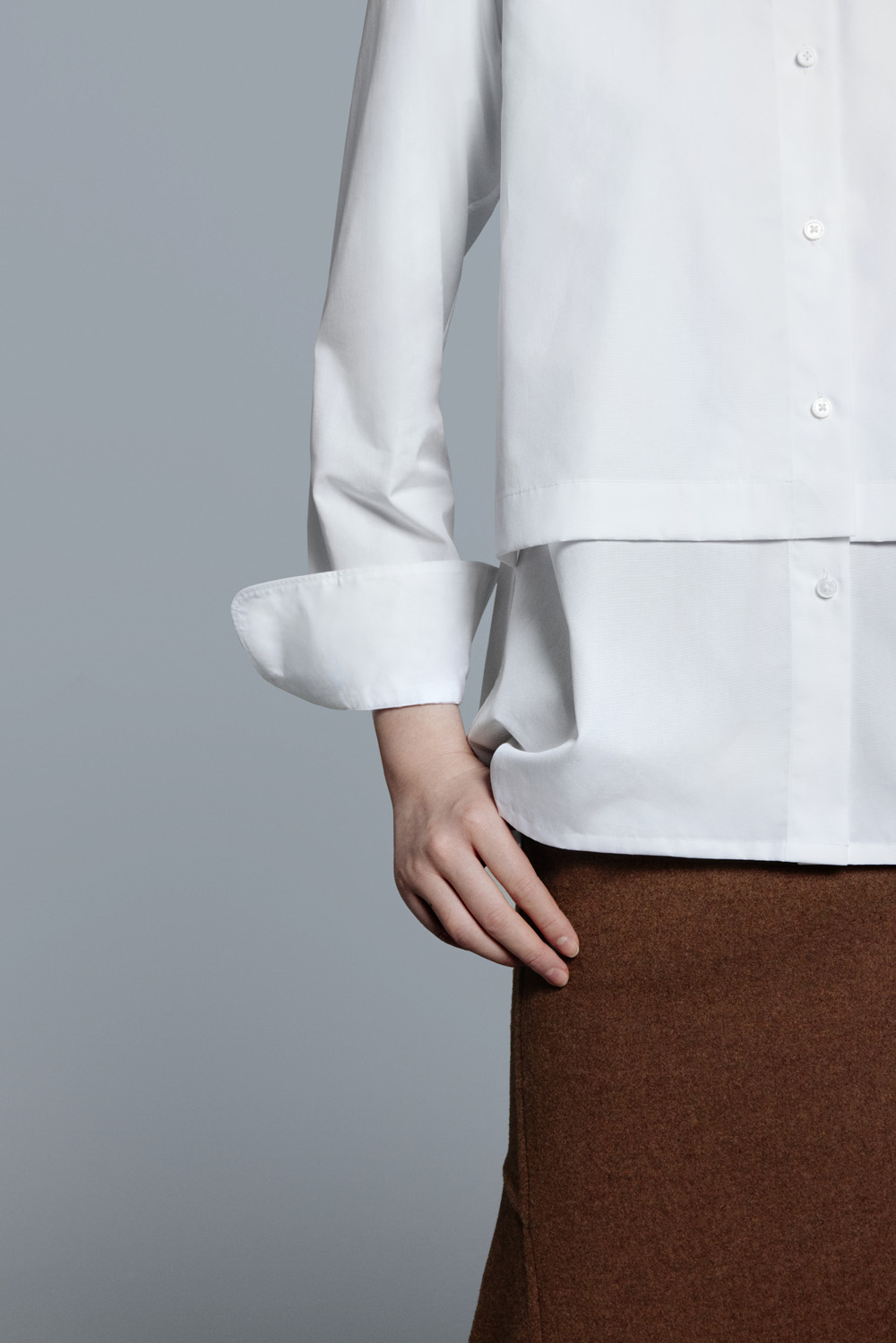 纯净度极高的冷白色调,经典百搭,加上简洁凝练的线条与偏光母贝纽扣点缀,如此经得起细细推敲的衬衫设计,恐怕只有在 Jil Sander 的+J 系列中才有了。