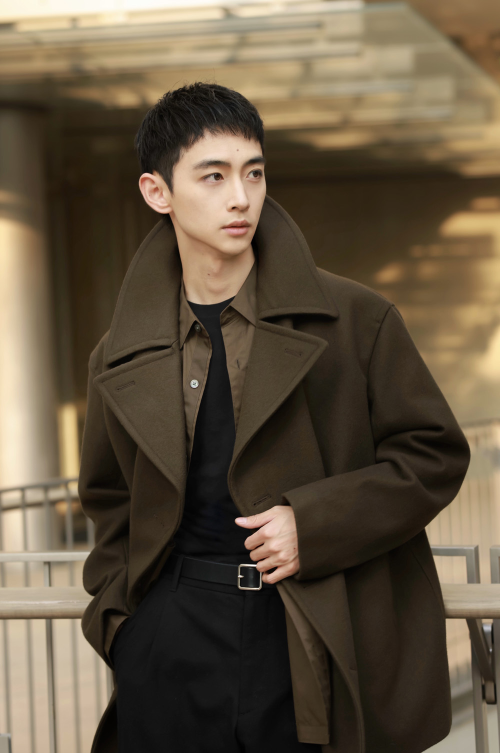这件双排扣风度外套的线条线条格外硬朗,独特大翻领设计可以演绎出多种造型。