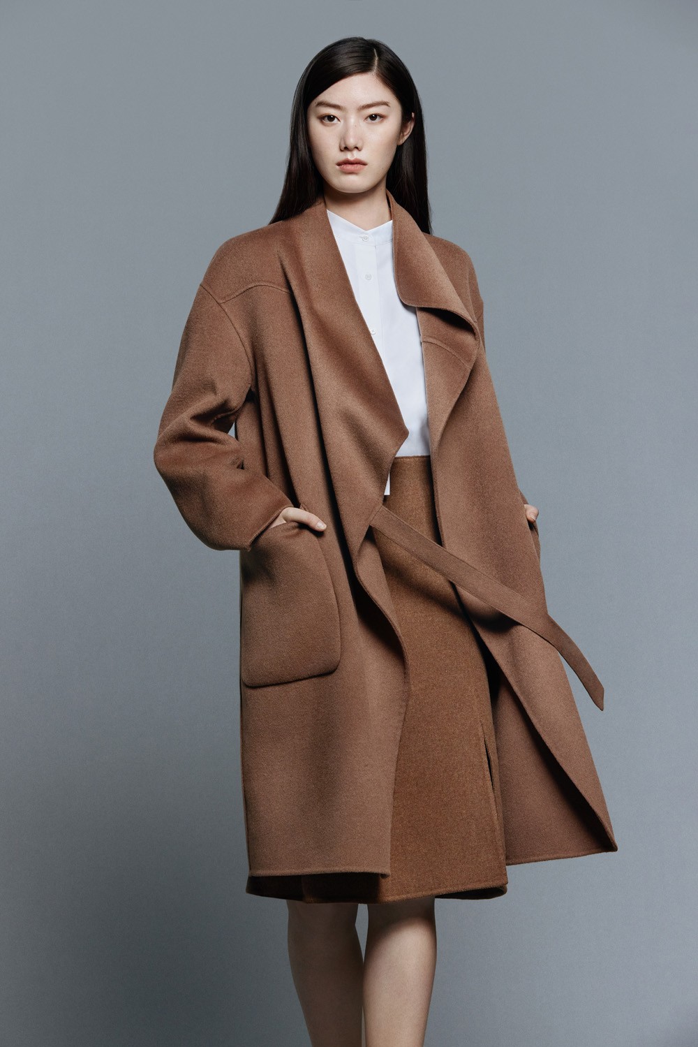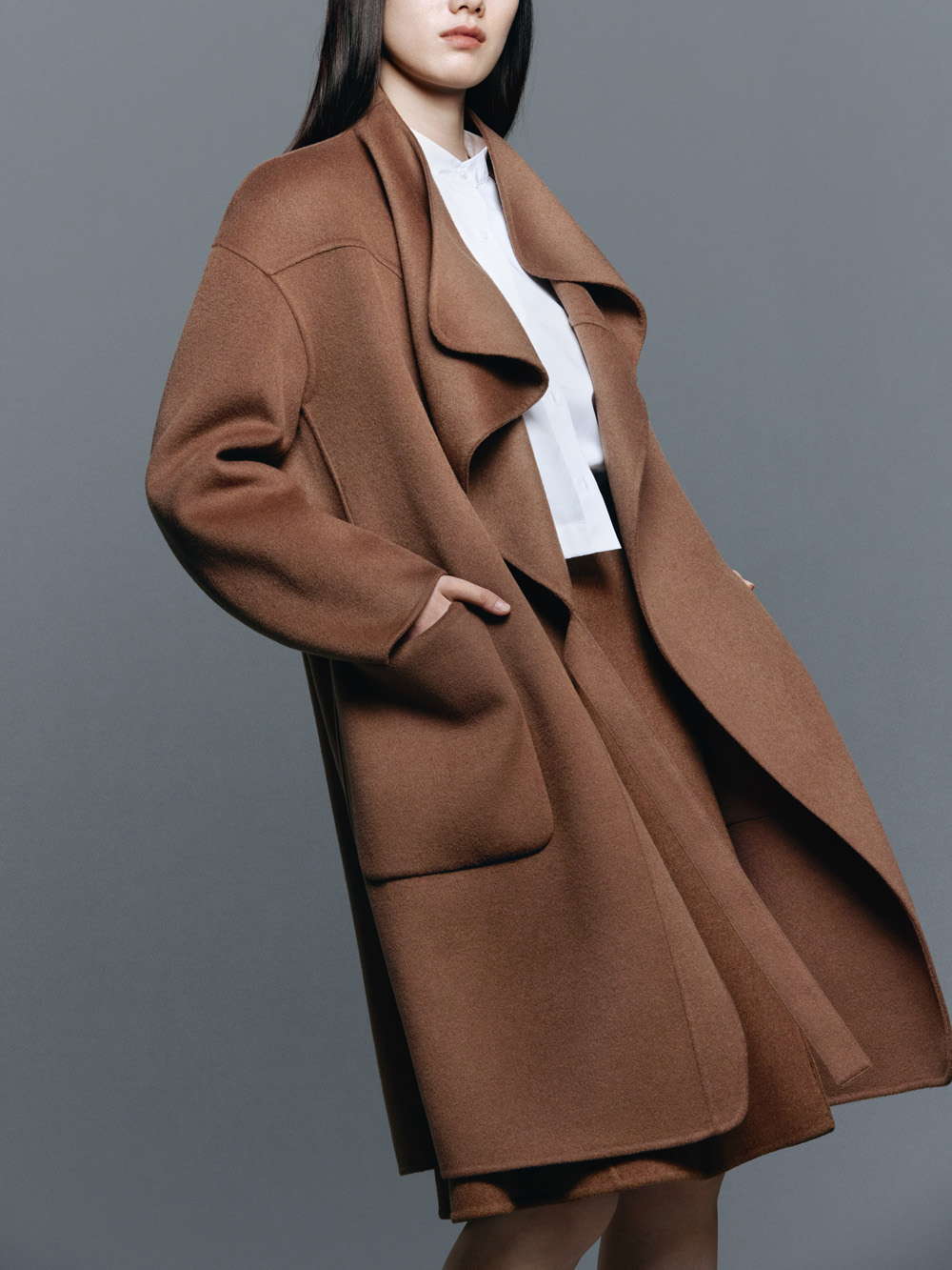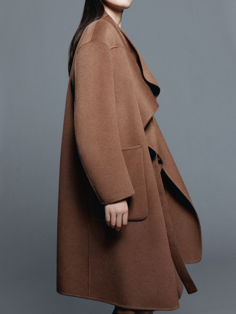 面料使用优质羊绒,丝滑细腻的纹理,呈现高级的光泽感;设计上打造立体领部、不对称前襟、侧开垂悬腰带与缝线剪裁,勾勒出流畅线条的同时还笔挺。